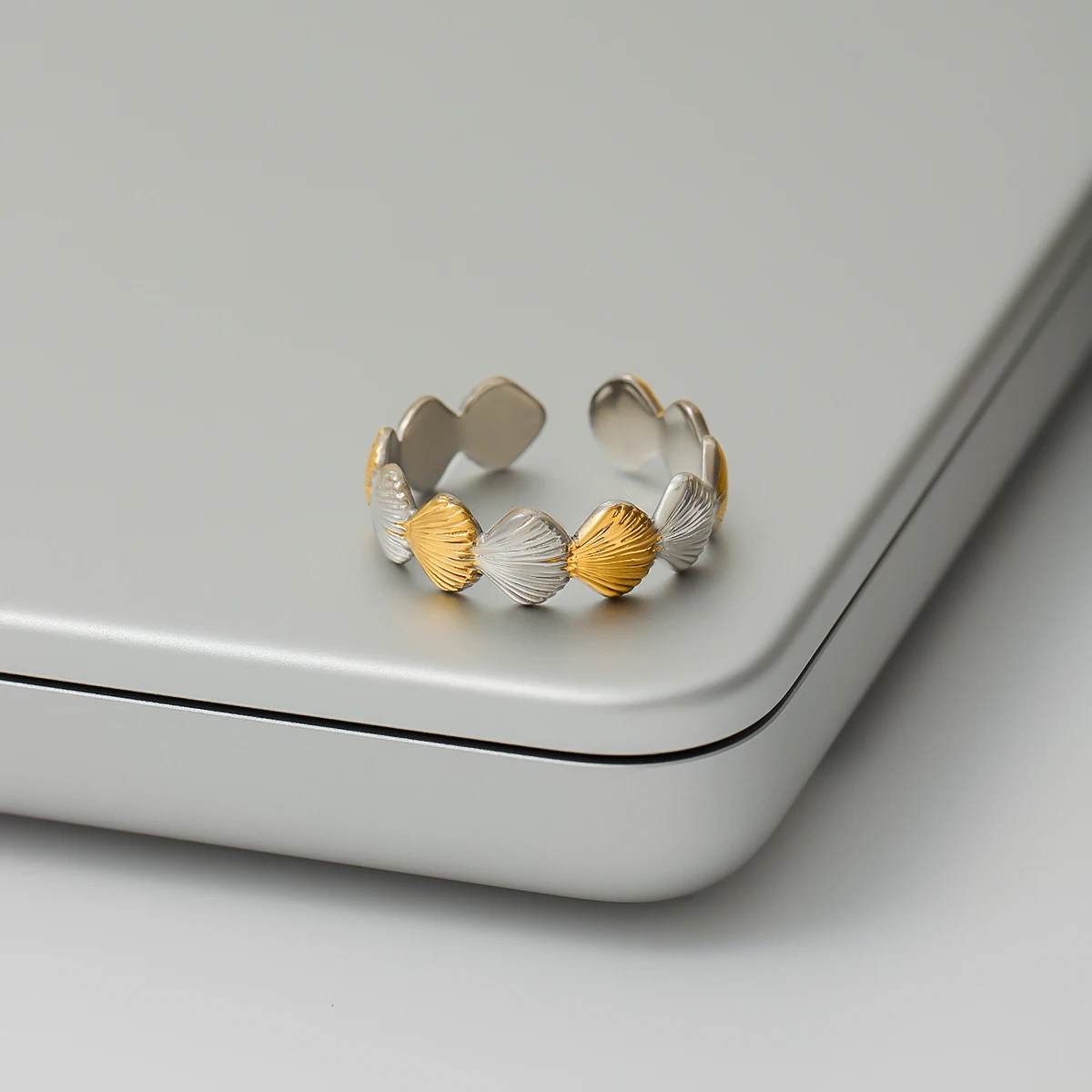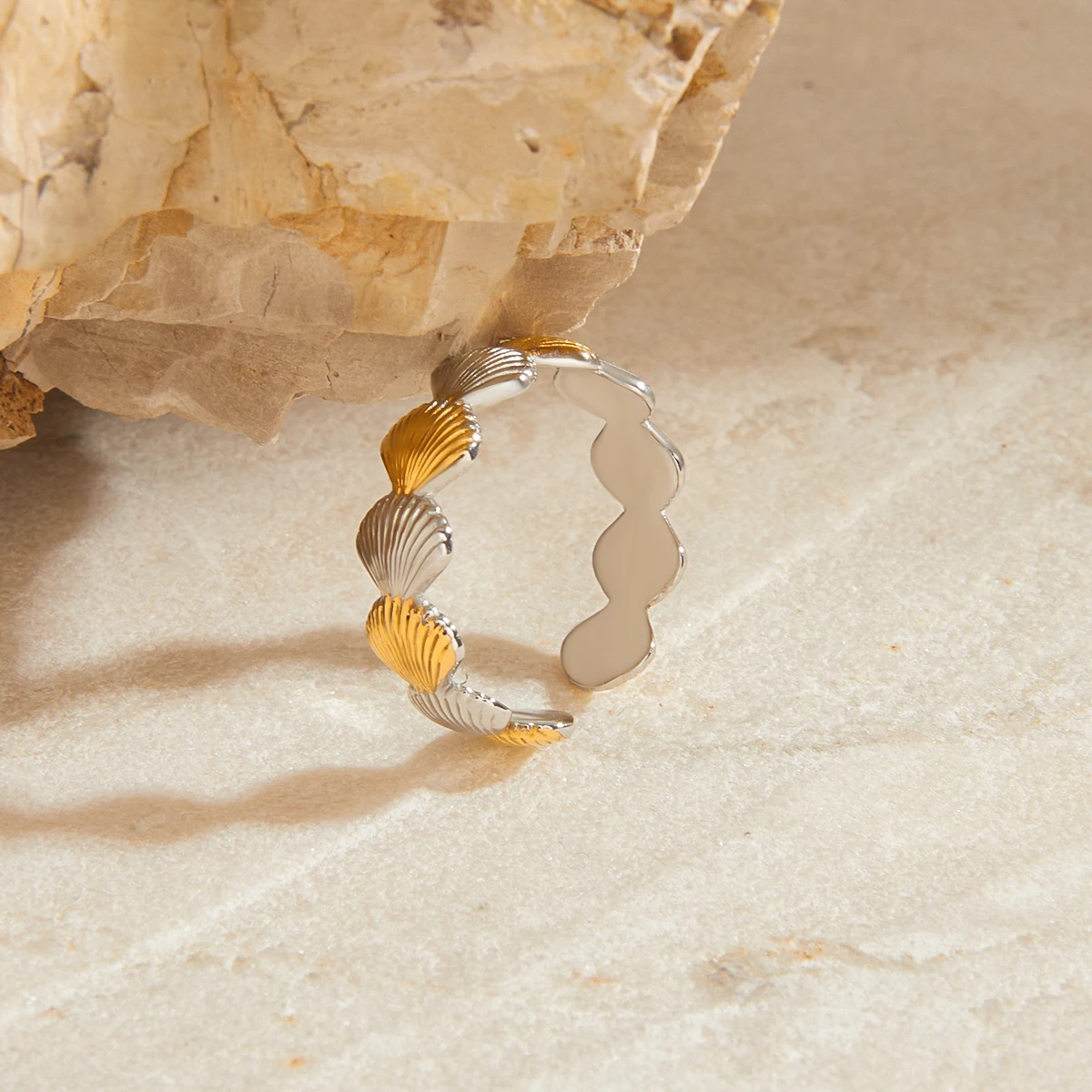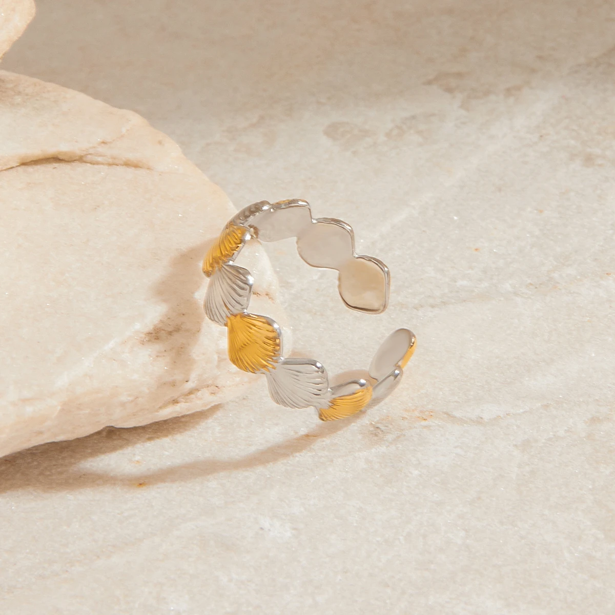 Discover the effortless elegance of this open cuff ring, crafted from durable stainless steel with a luxurious gold finish. Its two-tone design combines sleek silver and radiant gold, creating a bold, contemporary look that effortlessly elevates any outfit. The wide, flexible band provides a comfortable fit, adapting smoothly to your finger size, making it ideal for daily wear or special occasions. Adorned with finely detailed shell-shaped motifs along the top edge, featuring ridges and textured surfaces that mimic natural seashells, this piece combines natural inspiration with modern craftsmanship. Its animal-inspired design adds a unique charm, perfect for women who appreciate stylish and distinctive jewelry pieces. Feel confident in your style with this versatile accessory that blends natural motifs with contemporary flair.
