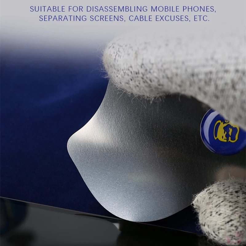 Imagine effortlessly opening your electronic devices with this sleek, stainless steel pry spudger. Designed for precision and durability, its ultra-thin profile and matte finish allow for easy maneuvering in tight spaces. The tool’s slightly curved, irregular shape enhances leverage, making disassembly smooth and safe. Its compact size of 56mm by 112mm fits comfortably in your hand, ensuring control during delicate repair tasks. The stylish blue sticker with a yellow gorilla logo adds a unique branding touch. Ideal for separating adhesive-sealed screens on iPhone, iPad, Samsung mobiles, and tablets, this tool combines functional simplicity with modern elegance. It’s a trusted companion for professional or DIY device repair enthusiasts seeking quality and reliability.