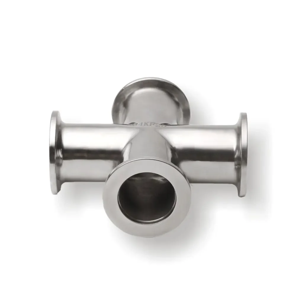 Experience seamless fluid distribution with this high-quality stainless steel vacuum fitting cross. Designed for durability and precision, it features four symmetrical ports with a polished, reflective surface made of SUS304 stainless steel. The smooth casting process ensures robust construction, perfect for sanitary environments like beer brewing, dairy processing, and beverage manufacturing. Its four port connections, each with an inner diameter of 32mm, allow for efficient fluid flow and easy integration into existing systems. The flange connection provides a secure seal, while the compact, symmetrical design ensures balanced distribution. Available in models KF10, KF16, KF25, KF40, and KF50, this fitting combines functionality with a sleek industrial look that complements any modern sanitary piping setup. Achieve reliable, hygienic processing today.