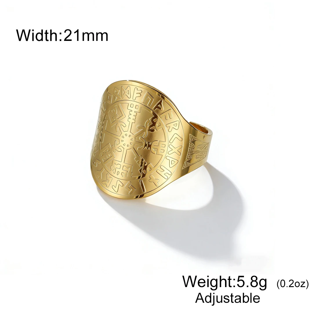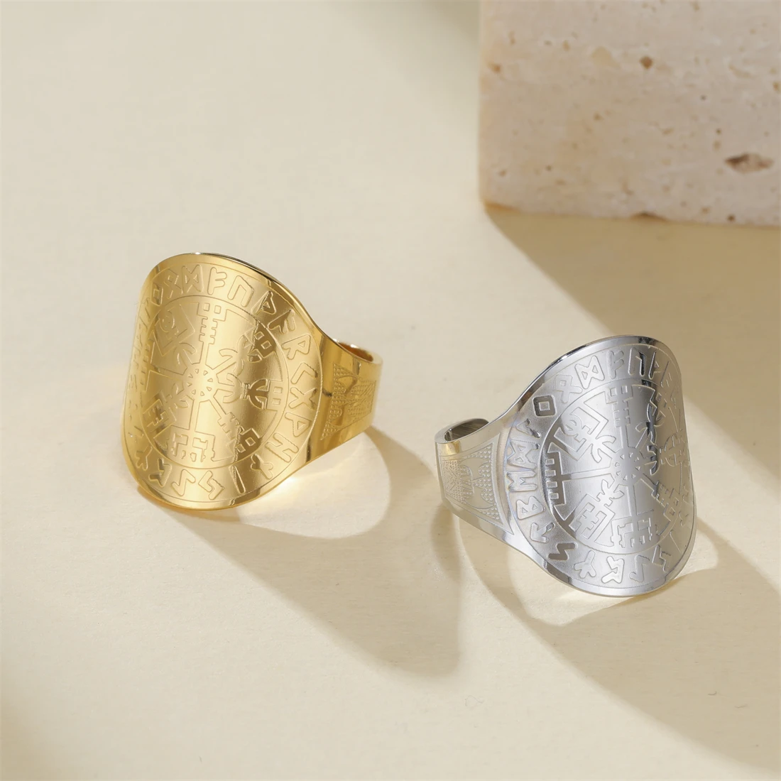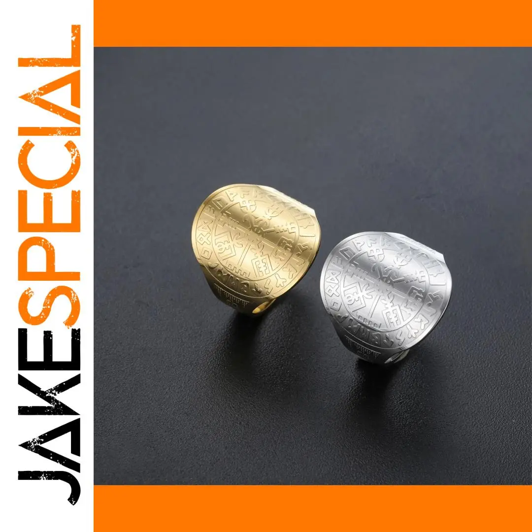 Experience the timeless appeal of this Viking Compass Vegvisir Ring, crafted from high-quality stainless steel with a bold, wide-band design. Available in striking gold-tone or sleek silver-tone finishes, this ring combines vintage Viking symbolism with modern craftsmanship. The intricate engraved Nordic runes and geometric Vegvisir motifs are raised and crisply detailed, creating a visually captivating contrast against the smooth, polished surface. Its geometric shape features rounded edges, giving it a clean, balanced look suitable for both men and women. The ring is resizable, ensuring a perfect fit. Perfect for everyday wear, special occasions, or as a meaningful gift, this jewelry piece embodies strength, protection, and style.