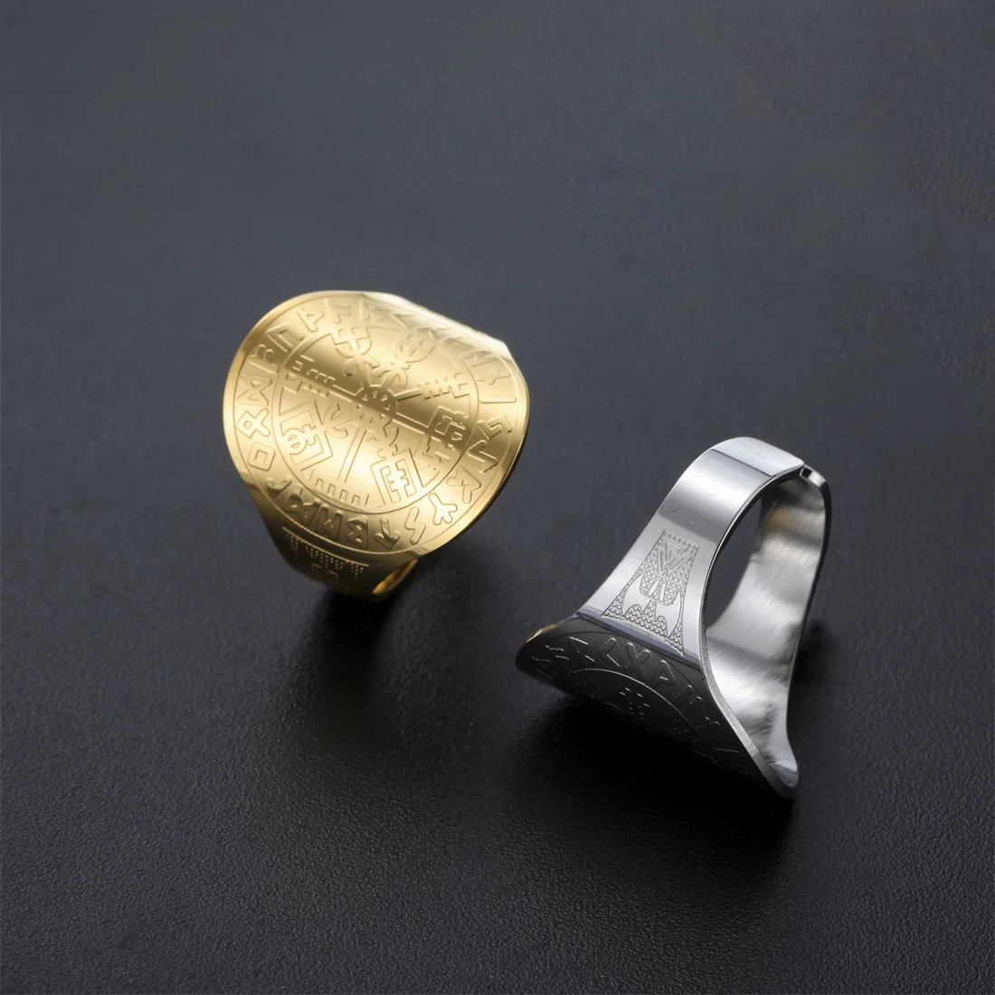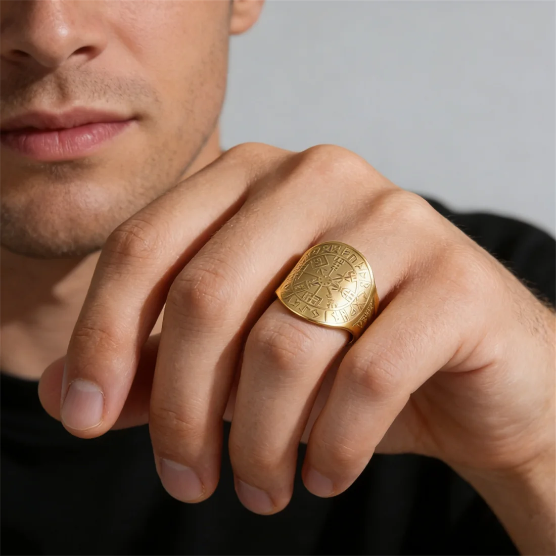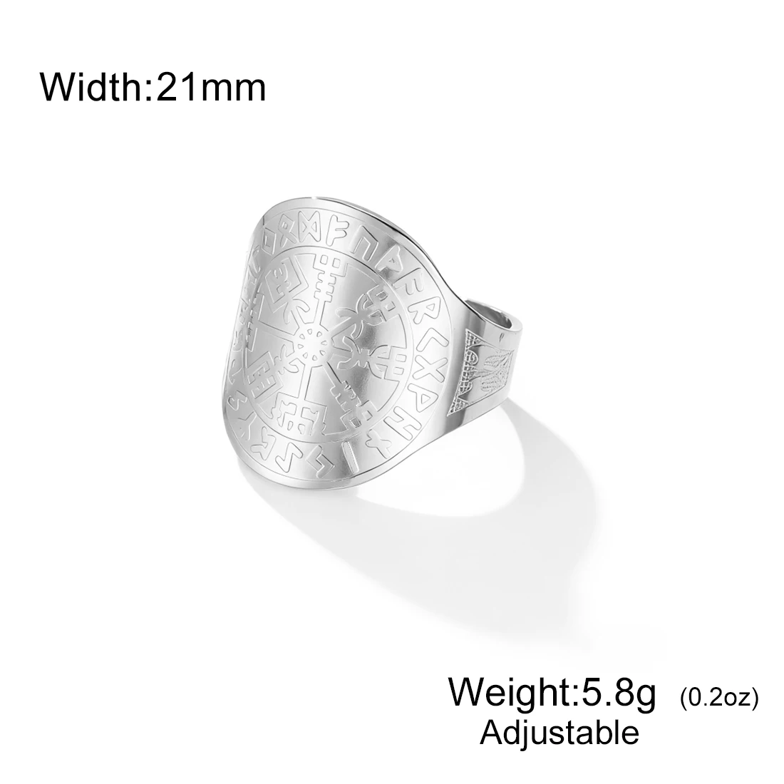 Experience the timeless appeal of this Viking Compass Vegvisir Ring, crafted from high-quality stainless steel with a bold, wide-band design. Available in striking gold-tone or sleek silver-tone finishes, this ring combines vintage Viking symbolism with modern craftsmanship. The intricate engraved Nordic runes and geometric Vegvisir motifs are raised and crisply detailed, creating a visually captivating contrast against the smooth, polished surface. Its geometric shape features rounded edges, giving it a clean, balanced look suitable for both men and women. The ring is resizable, ensuring a perfect fit. Perfect for everyday wear, special occasions, or as a meaningful gift, this jewelry piece embodies strength, protection, and style.
