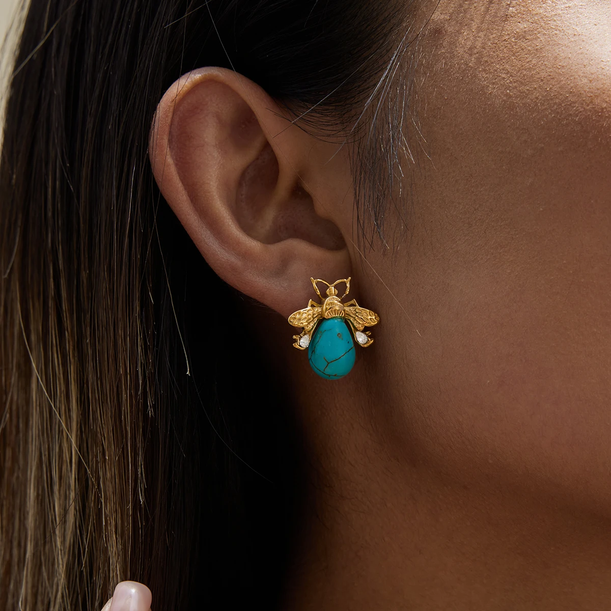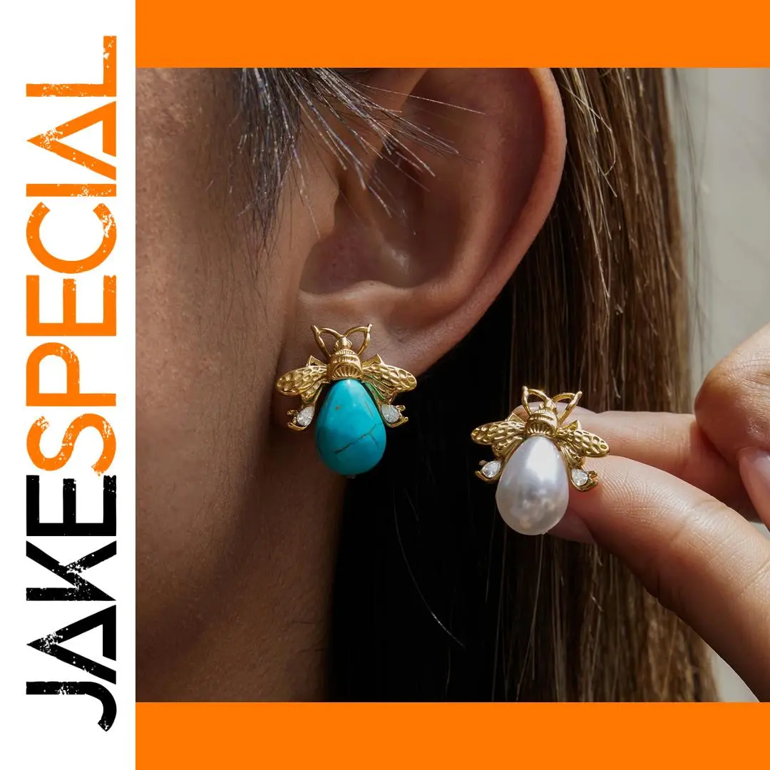 Elevate your style with these vintage-inspired stainless steel earrings finished in platinum, featuring intricate bee motifs adorned with sparkling white zircon stones and vibrant blue turquoise pendants. Each stud measures approximately [insert size], secured with push-back fittings, and combines modern elegance with timeless charm. Designed for women, these fashion-forward earrings showcase detailed craftsmanship, textured wings, and contrasting pendants—one luminous pearl and one lively turquoise—adding a unique touch to any ensemble. Perfect for adding a sophisticated statement to your look, these earrings are free from high-concern chemicals, ensuring both style and safety.