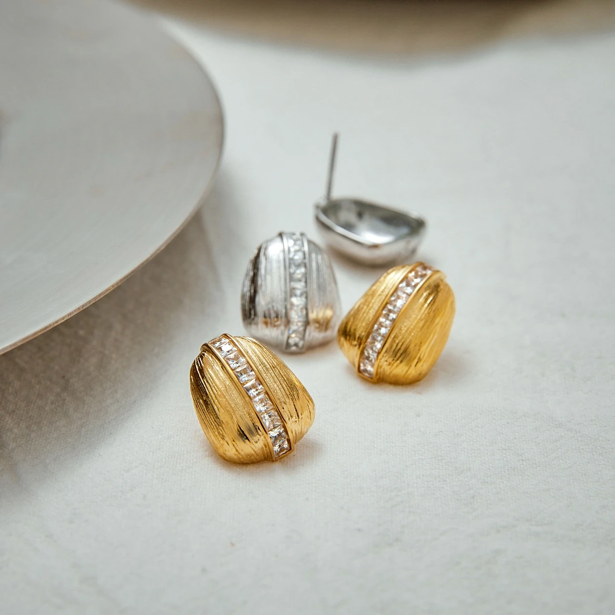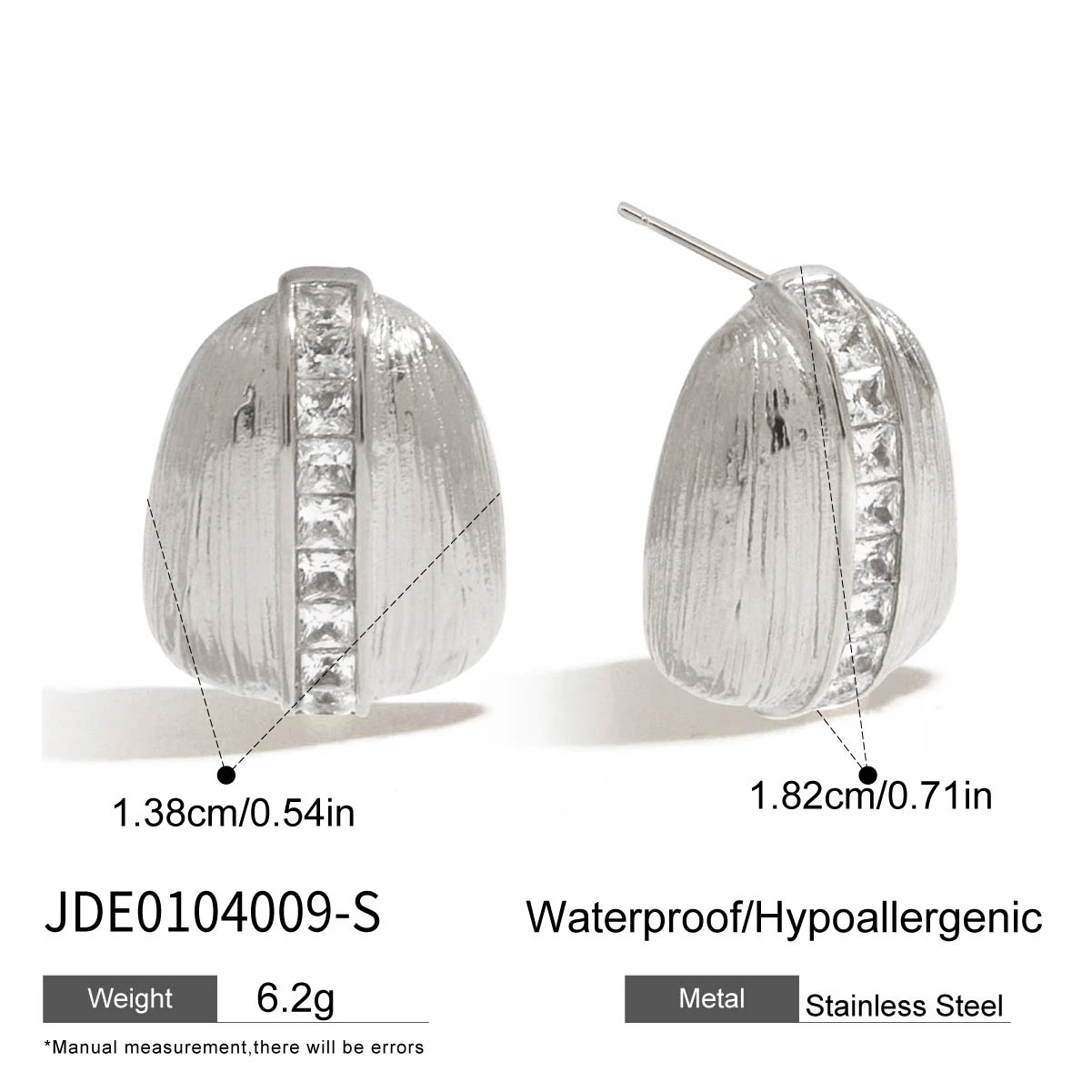 Enhance your jewelry collection with these stylish water drop-shaped stud earrings crafted from stainless steel with a gold-over finish and platinum overlay. Featuring a textured, ridged surface that mimics a water droplet, they are accented with a vertical strip of sparkling cubic zirconia, creating a sophisticated contrast. The secure screw-back fastening ensures a comfortable, reliable fit. Designed as trendy yet elegant accessories for women, these earrings are model JDE0104009, also available as JDE0104009-S. Their modern water drop motif, combined with durable stainless steel material, makes them perfect for adding a touch of shimmer and texture to your everyday or special occasion look.