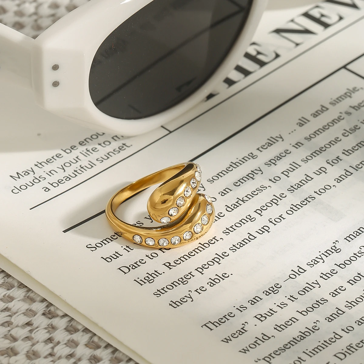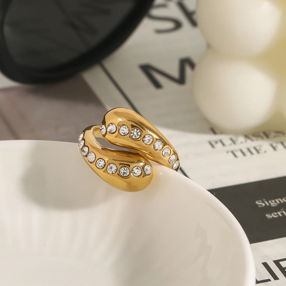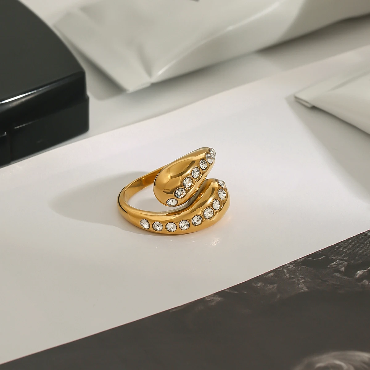 Imagine elevating your look with this stunning, modern fashion ring, crafted from high-quality stainless steel with a durable PVD gold finish. Its sleek, open-ended design features a unique double-band coil forming a delicate water drop shape that catches the eye. Adorned with tiny, shimmering white rhinestones in a pave setting, the ring adds a touch of elegance and sparkle to any outfit. Its polished gold surface exudes luxury, while its innovative craftsmanship ensures longevity, resisting fading, scratching, and tarnishing. Perfect for special occasions or parties, this piece harmoniously blends contemporary style with everyday wearability. Feel confident knowing you’re wearing a well-made accessory that combines beauty and durability in one sleek package.