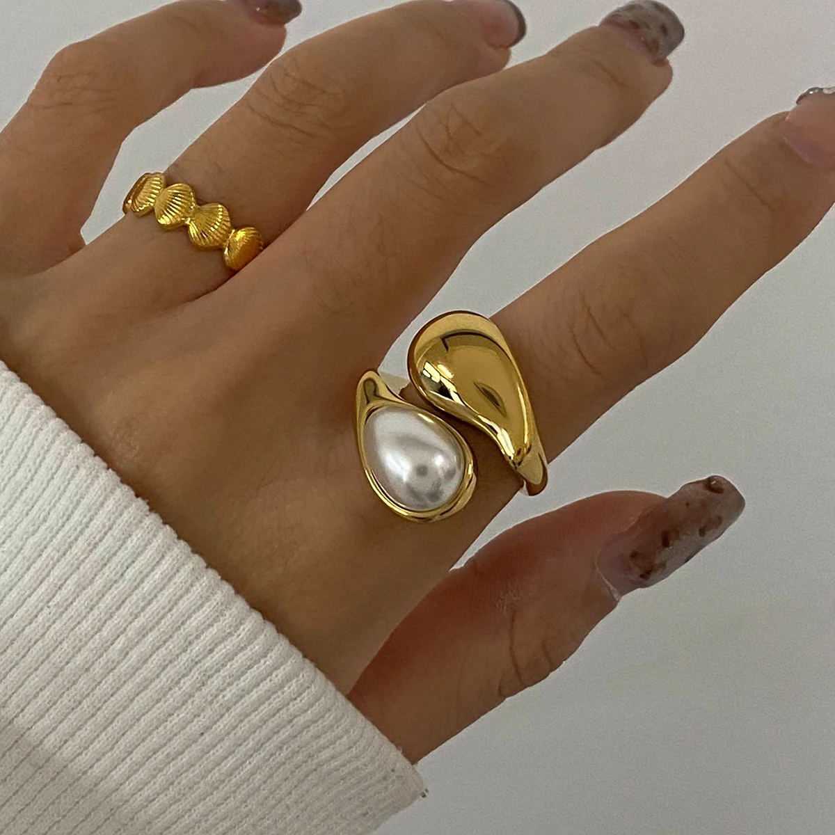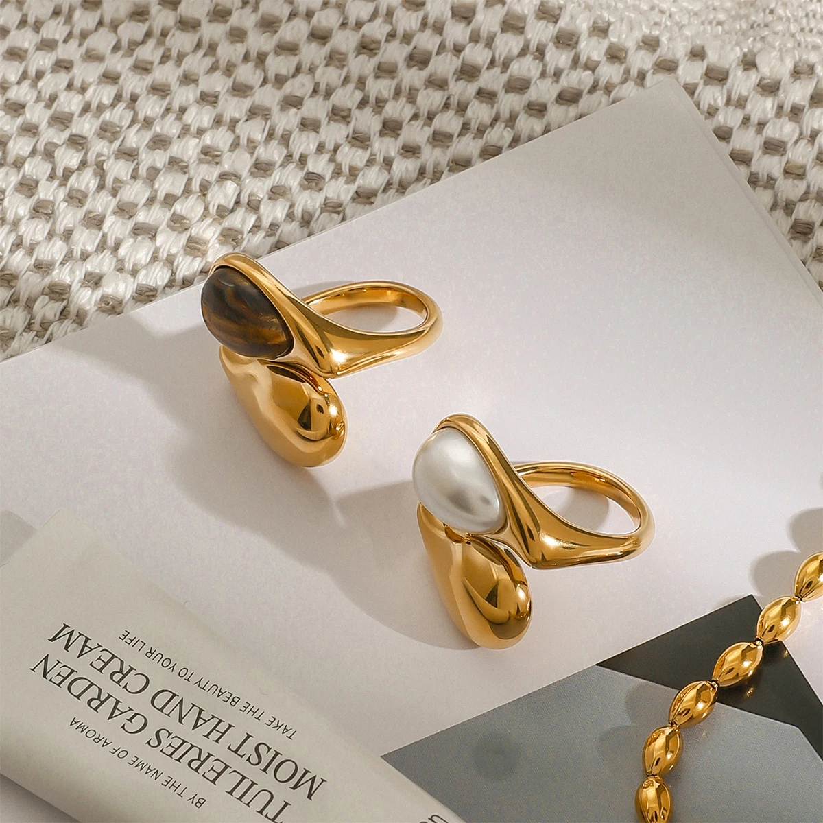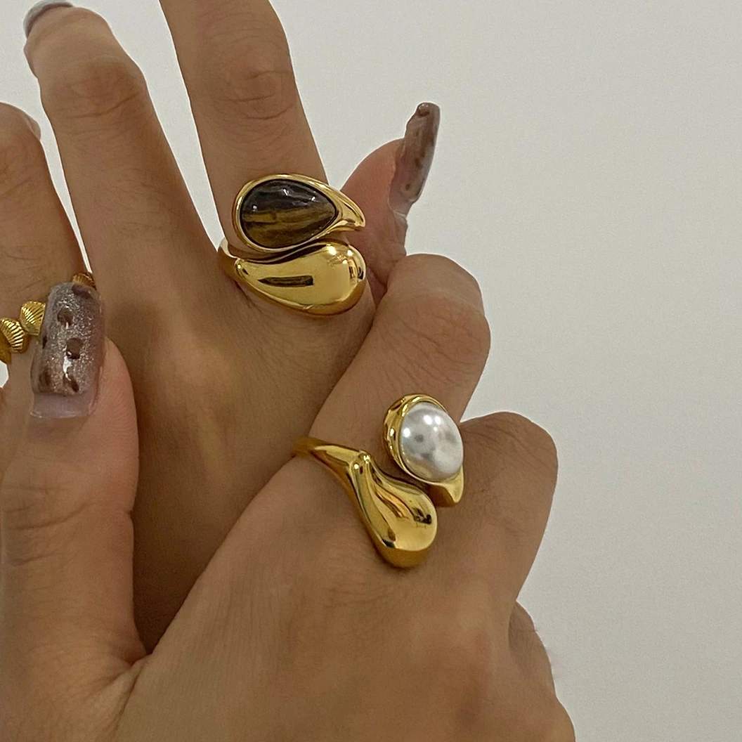 Experience modern elegance with this unisex stainless steel water drop-shaped ring, crafted with durable gold-tone finish for lasting shine and resistance to corrosion. Sized at 7, it features two striking stone options: a tiger’s eye-like stone with chatoyancy for depth and warmth, or a luminous, smooth imitation pearl for refined sophistication. The ring’s sleek, high-polished surface showcases organic, flowing curves that blend artistic minimalism with bold sculptural aesthetics. Perfect for parties or fashion-forward occasions, this avant-garde accessory elevates any style with its contemporary design, craftsmanship, and versatile appeal, making it a standout piece for expressing individual style with confidence.