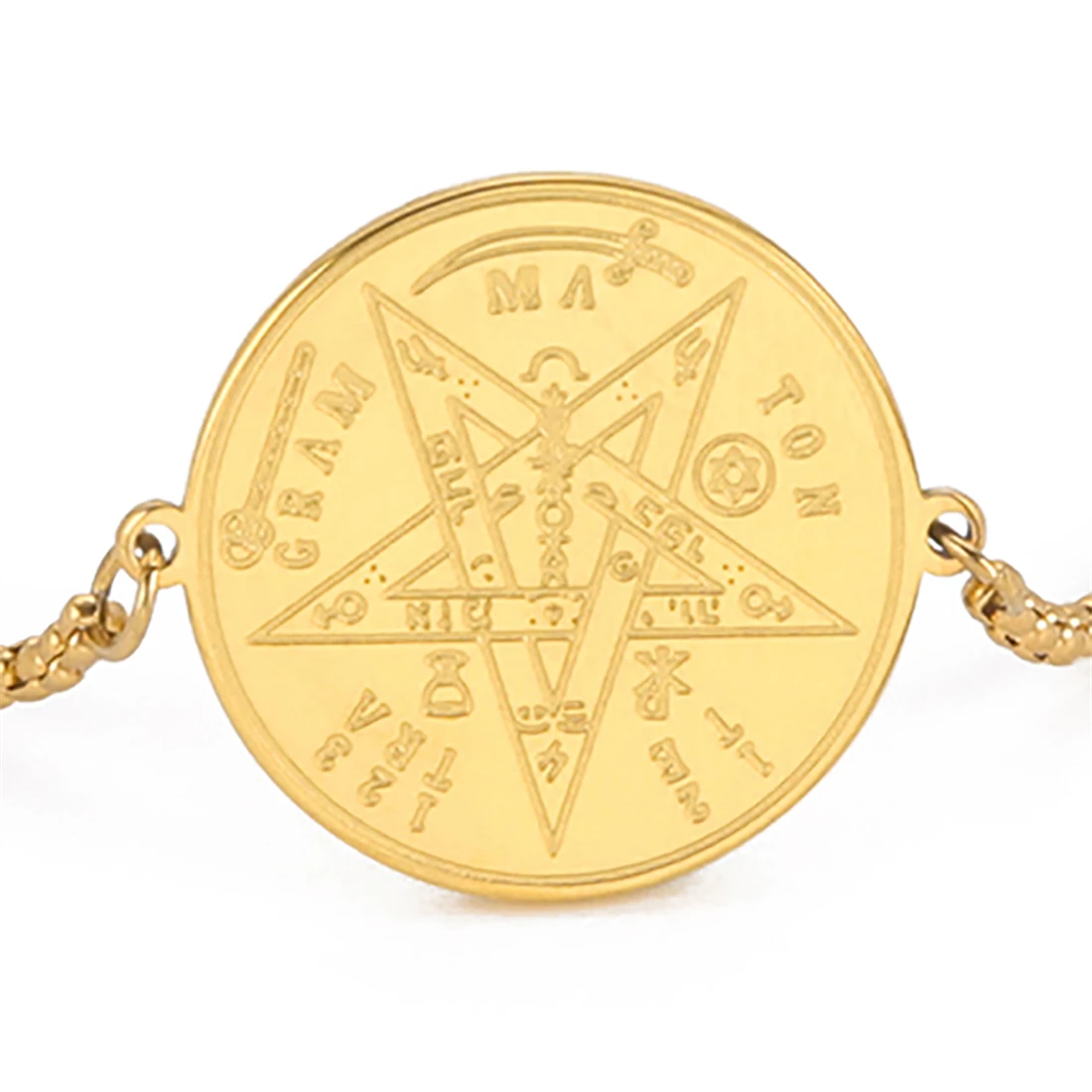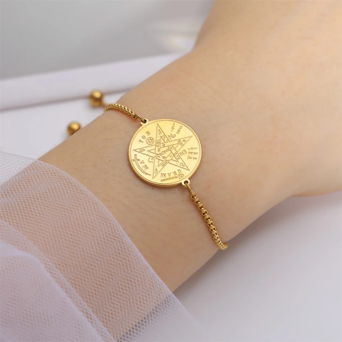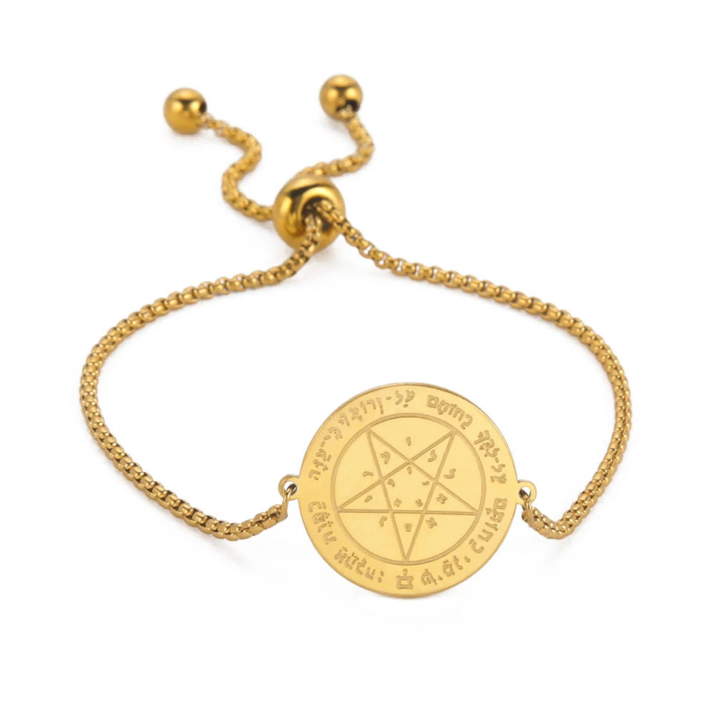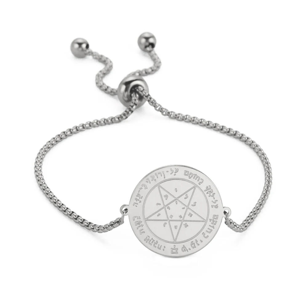 Imagine yourself wearing this exquisite Wicca Tetragrammaton Pentacle Bracelet, beautifully crafted from premium stainless steel. Its polished gold-tone or silver finish highlights the intricate engraved pendant, reflecting light with a luxurious glow. The round pendant measures 23.8 by 20 millimeters, featuring detailed engravings of a pentagram surrounded by mystical symbols, inscribed with meaningful words and letters that evoke protection and spiritual power. The sleek chain includes small linked beads that add a refined, vintage touch. With a length adjustable from 17 to 22 centimeters via a pearl clasp, it offers both comfort and elegance. This versatile accessory complements any occasion, making it a perfect gift for yourself or loved ones seeking sacred symbolism and sophisticated style.
