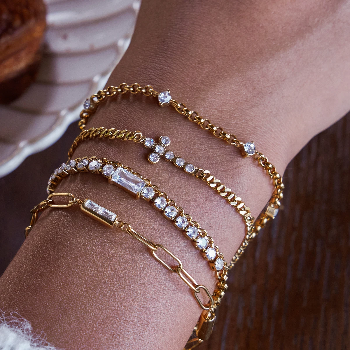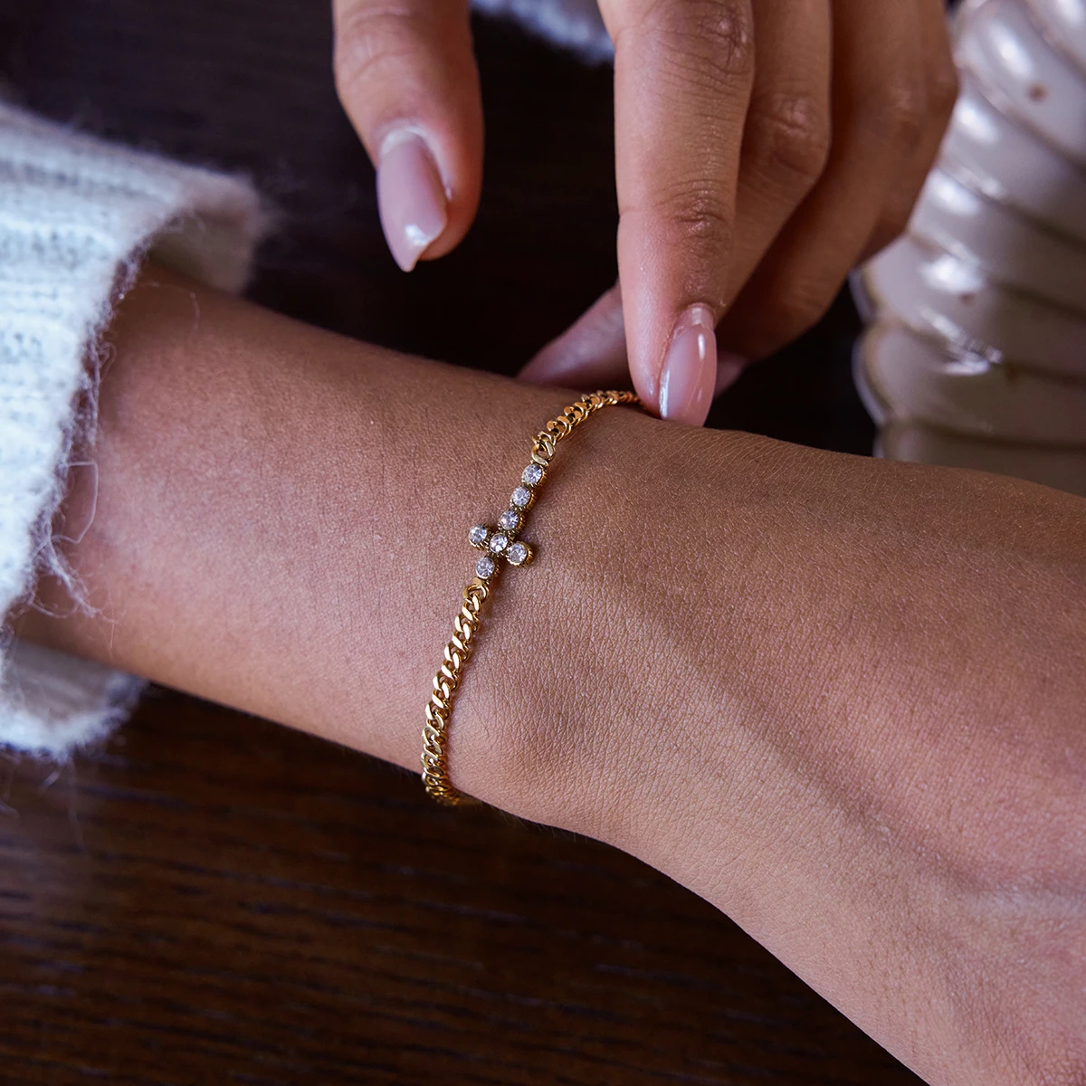 This stainless steel women’s bracelet with a gold finish offers a durable, luxurious look. It features a delicate chain link design embedded with a subtle cross-shaped pattern and sparkling cubic zirconia stones set in prong settings, adding an elegant touch. An adjustable lobster-claw clasp ensures a secure, comfortable fit for all wrist sizes. Available in model numbers JDB0307032, JDB0307034, and JDB0307038, this versatile piece combines timeless symbolism with modern style, making it a perfect accessory for everyday elegance or special occasions. Its polished surface and refined details make it an essential addition to any jewelry collection.