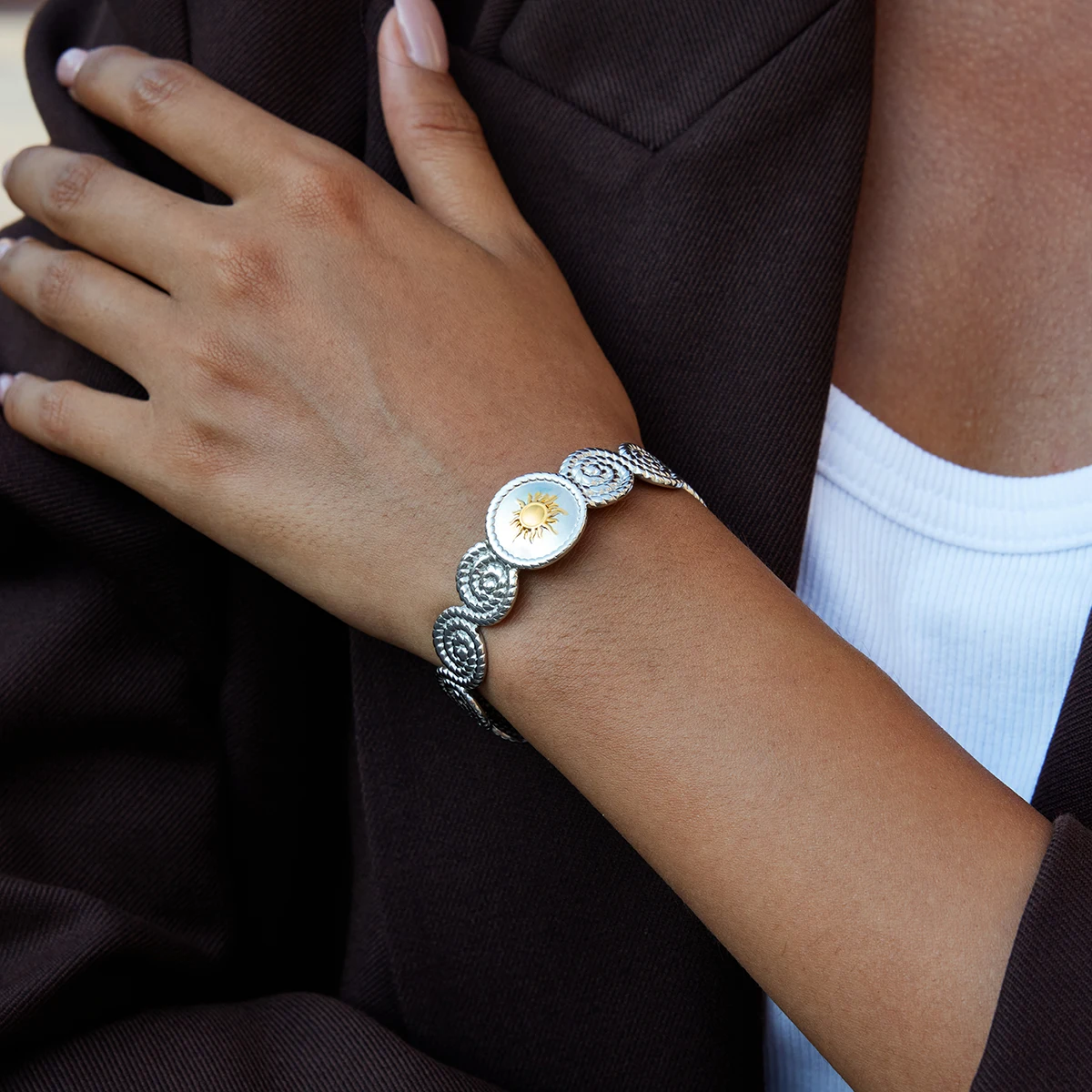 Immerse yourself in contemporary elegance with this fashionable women's cuff bracelet crafted from durable stainless steel. Featuring a sleek platinum-colored finish complemented by a striking gold-tone sunburst centerpiece, this accessory exudes modern sophistication. The double-color, spiral-threaded design adds a layered, textured look that captures attention effortlessly. Set against a trendy, round shape, the bracelet is designed for a comfortable fit, making it perfect for daily wear or special occasions. Its versatile style seamlessly enhances casual or elegant outfits, letting you express your unique fashion sense. This timeless piece is a great addition to any jewelry collection, offering both durability and aesthetic appeal that will make you stand out confidently.