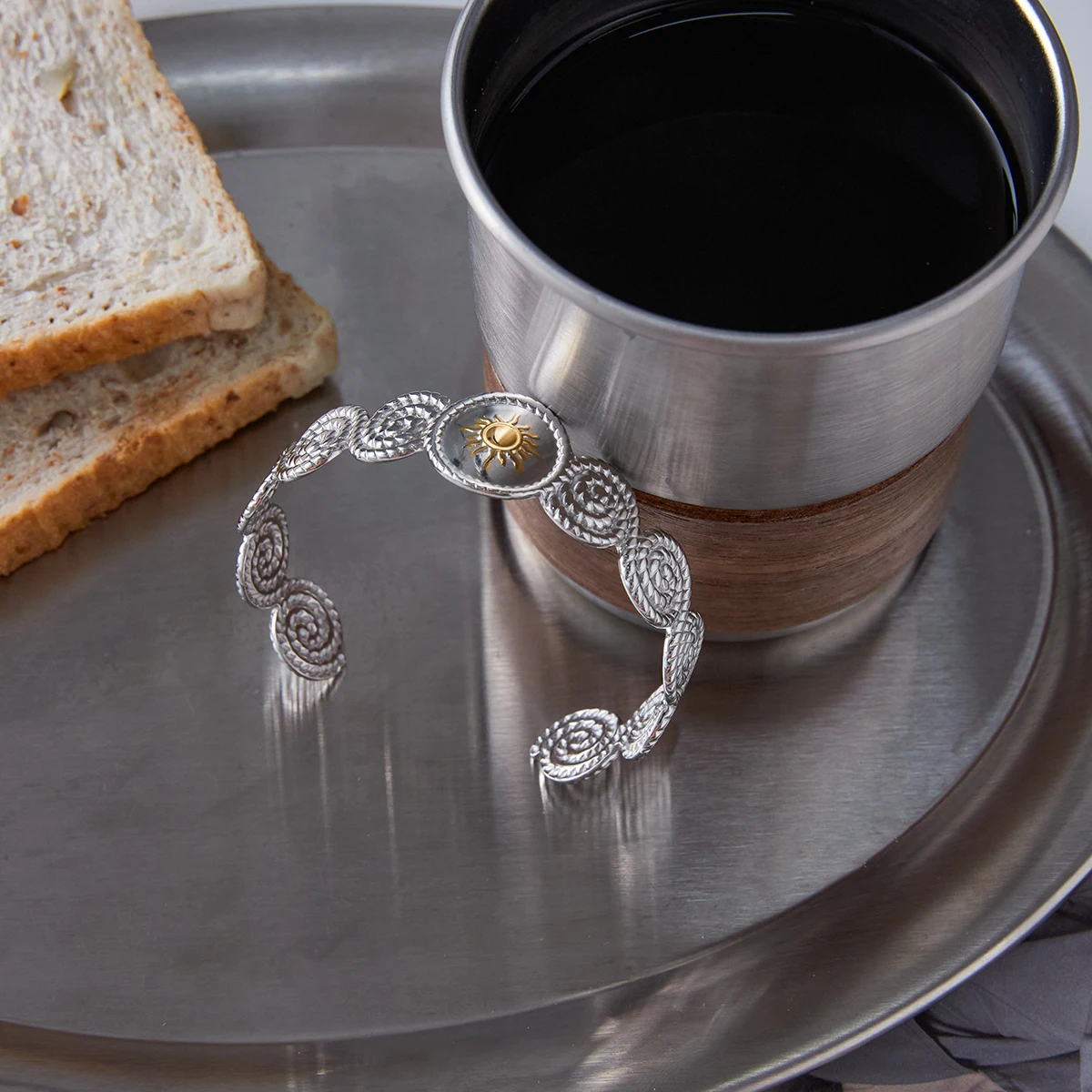 - Centered with a shiny, gold-colored sunburst element, radiating warmth and elegance, flanked by intricate coil-patterned decorative elements.