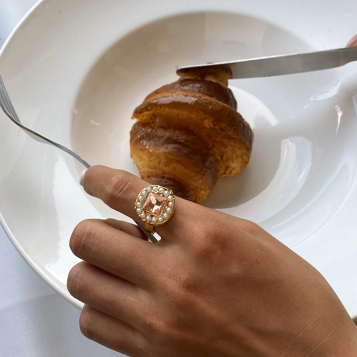 - The border is adorned with small, round white pearls, adding an elegant, feminine touch to the bold geometric design of the ring.