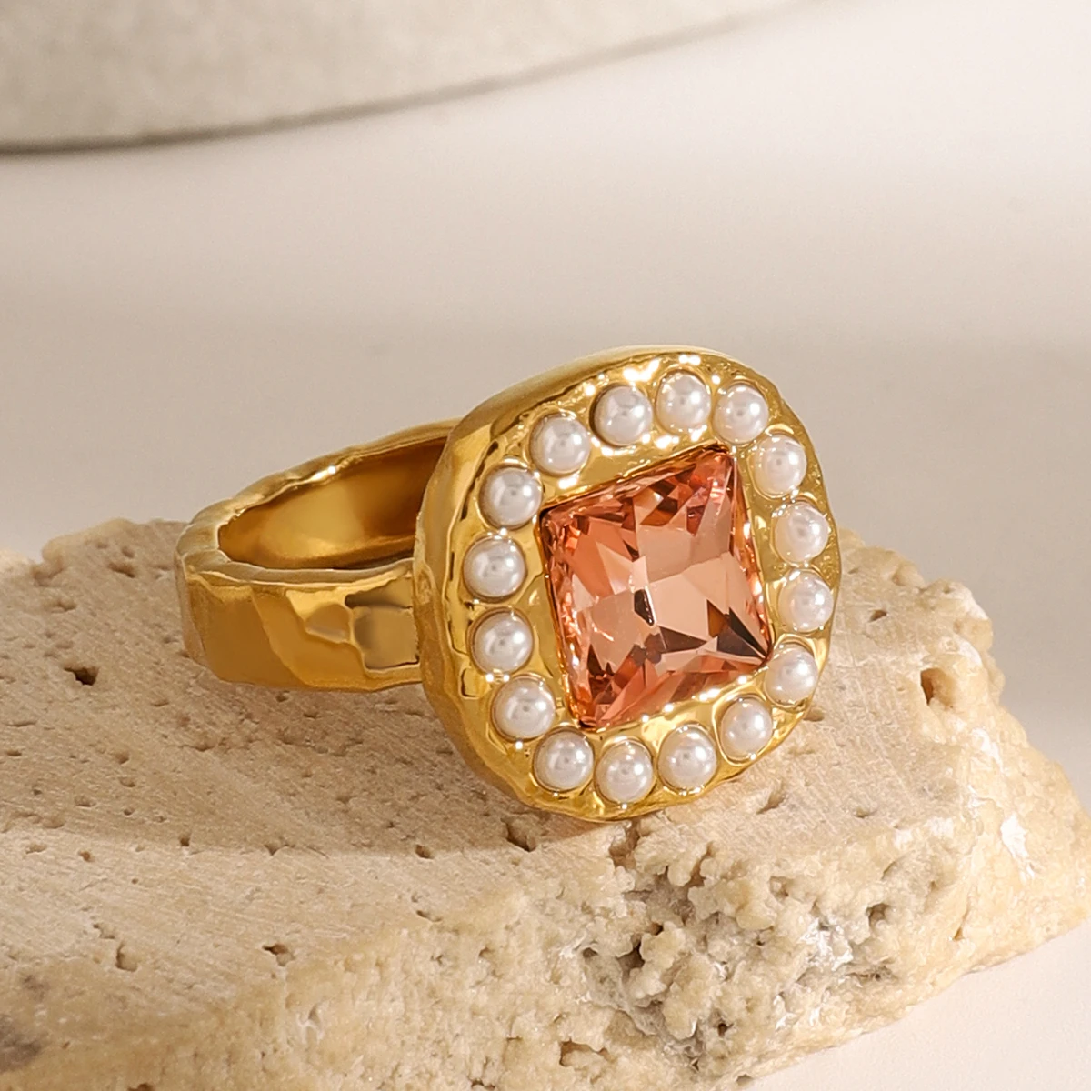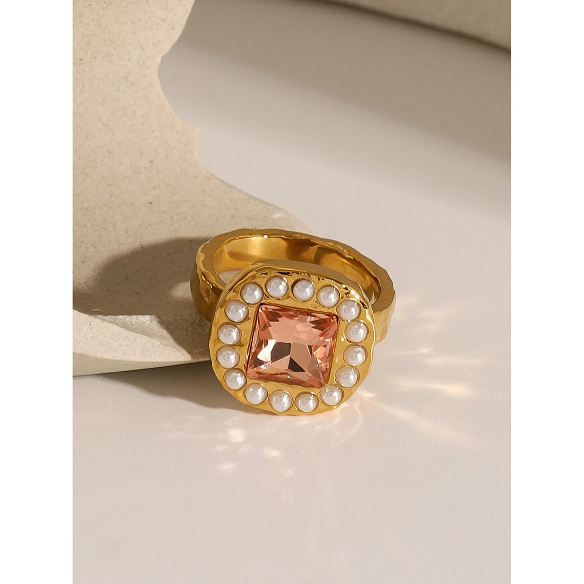 Experience the bold elegance of this stylish stainless steel ring designed for women. Featuring a large, sparkling peach-pink square gemstone, this piece captures attention with its vibrant color and faceted shine. Surrounded by a sleek border of white pearls, it blends feminine delicacy with a modern, trendy vibe. Crafted from durable PVD gold-coated stainless steel, it resists fading, scratching, and tarnishing for long-lasting beauty. With its adjustable band, this ring offers a comfortable fit for various finger sizes and is perfect for enhancing any outfit, whether at parties or stylish outings. Its eye-catching design combines color, sparkle, and sophistication into a versatile statement piece that elevates your jewelry collection.