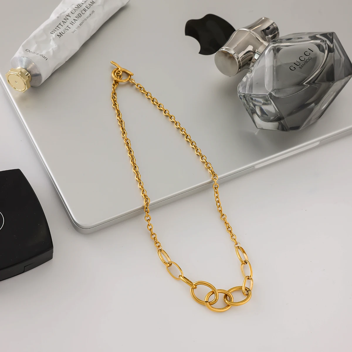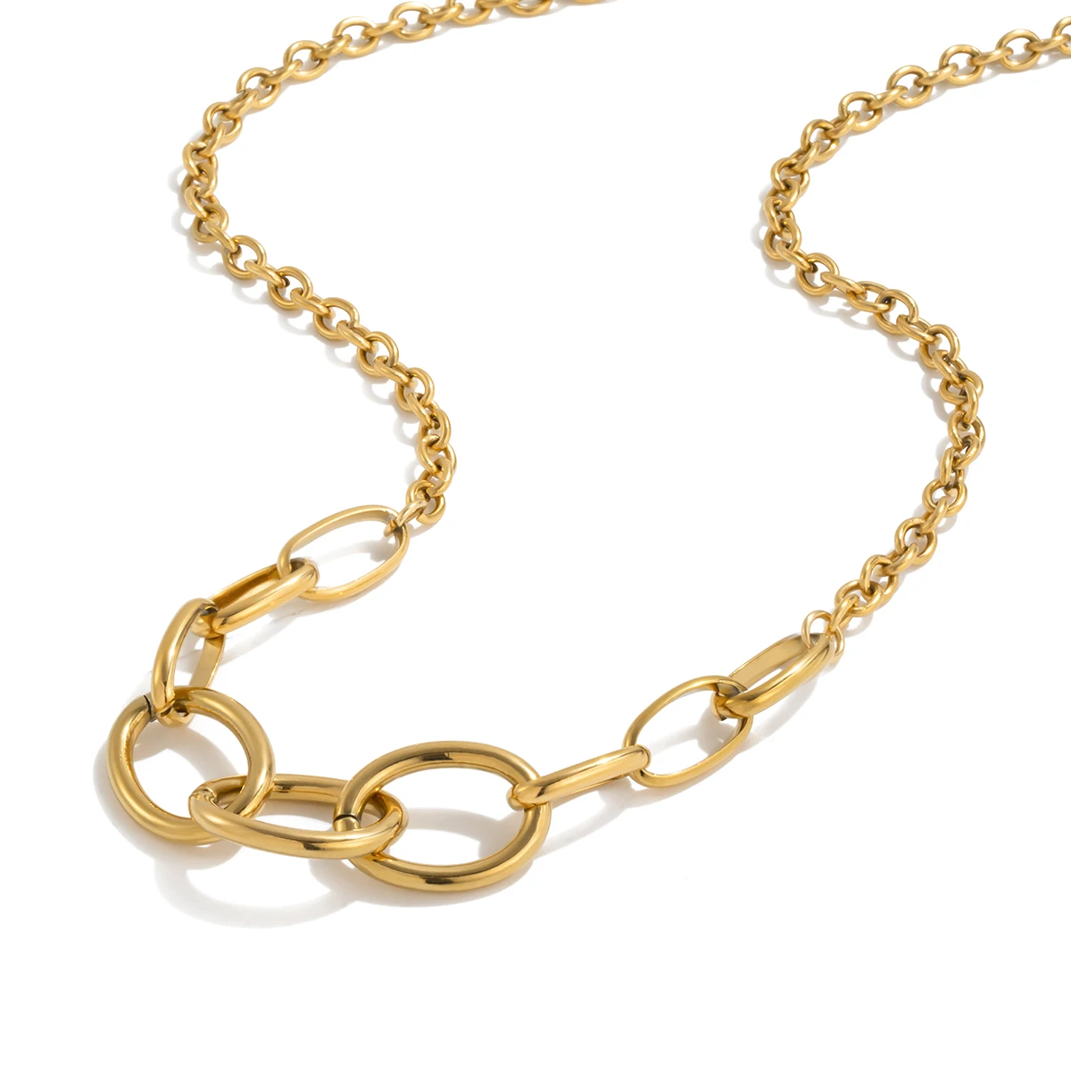 Experience the perfect blend of elegance and modern fashion with this stainless steel necklace featuring a sophisticated design. The chain showcases a pattern of alternating small round links with larger, elongated oval links, creating an eye-catching yet delicate look. Finished with a shiny gold-colored coating, it exudes luxury and versatility, ideal for various party occasions. Its standard length comfortably fits most neck sizes, accentuating your neckline beautifully. Crafted from durable stainless steel, this necklace will maintain its polished appearance over time. Its trendy, fashionable style makes it a versatile accessory for both everyday wear and special events, instantly elevating your outfit. Imagine yourself wearing this beautiful piece, adding a bold yet delicate statement to any ensemble.