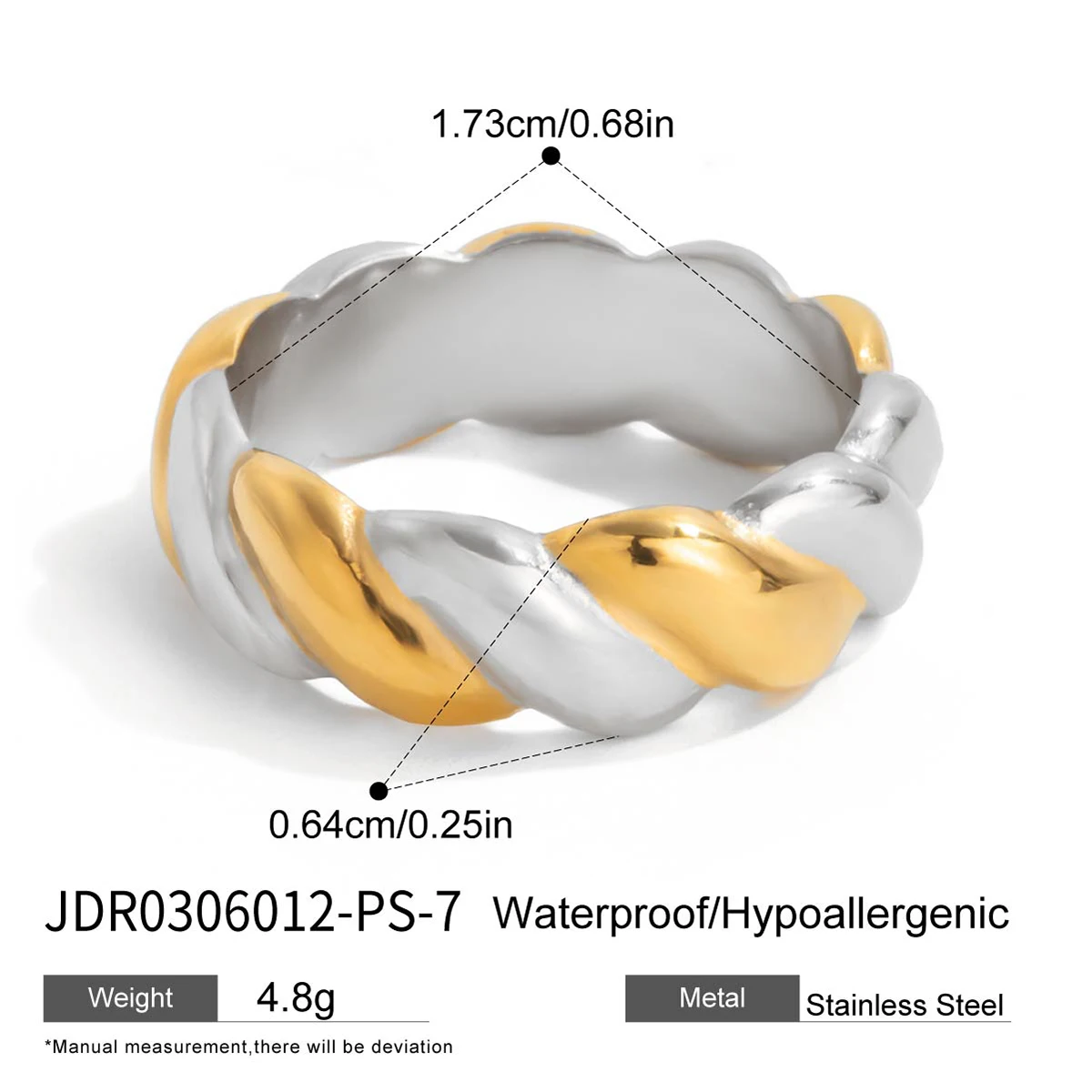 Elevate your style effortlessly with this fashionable women's ring crafted from high-quality stainless steel, featuring a striking two-tone threading pattern inspired by fried dough twists. Its bold, chunky design showcases a textured irregular shape that catches the light beautifully, adding a touch of modern elegance to any outfit. The ring's 2mm surface width and size 7 (measuring 54.4mm in circumference) ensure a comfortable fit while standing out with a unique, trendy aesthetic. Perfect for parties, casual outings, or stylish everyday wear, this versatile jewelry piece is designed to appeal to those who love fashionable accessories that combine durability with eye-catching detail. Add this statement ring to your collection today and enjoy timeless style.