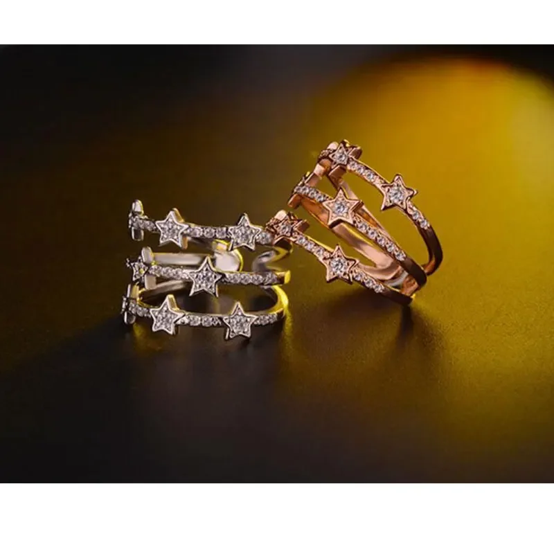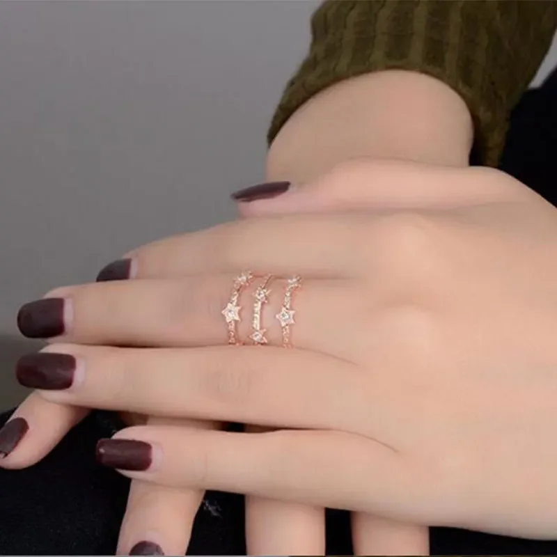 - Each ring features a star-shaped motif outlined and filled with tiny zircon stones that imitate diamonds, creating a celestial and trendy aesthetic suitable for women.