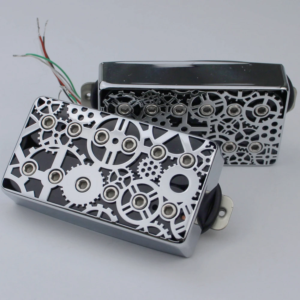Experience the captivating blend of industrial design and musical performance with this this set of two Les Paul-style guitar pickups. Featuring a unique steampunk-inspired aesthetic, each pickup showcases rectangular metal housings with intricate gear and cog cutout patterns, revealing striking internal components. The shiny, CNC-machined finish adds a sleek, modern touch to traditional hardware motifs. Designed for enthusiasts who appreciate both style and sound quality, these pickups deliver powerful tone and bold visual appeal. Ideal for upgrading or customizing your electric guitar, they promise to enhance your playing experience while turning your instrument into a true work of art.