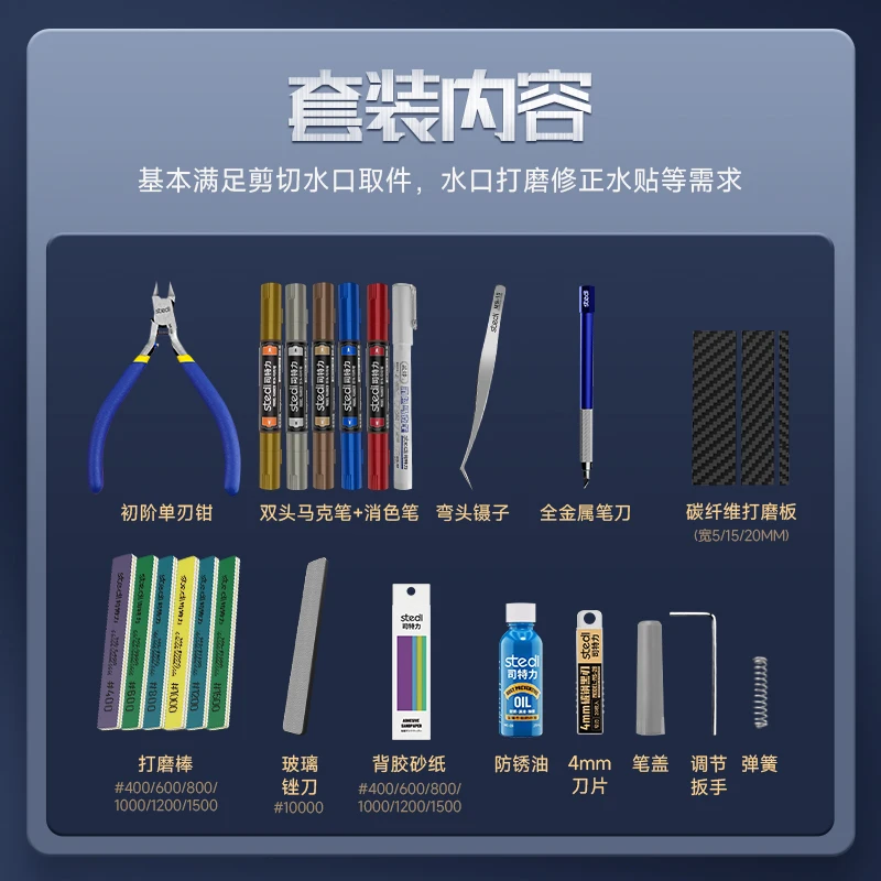Imagine elevating your model-making projects with this expertly organized Set from Stedi. Featuring a sleek blue box with black foam lining, it keeps your tools perfectly arranged for quick access. Inside, you'll find vibrant dual-tip markers with metallic and black caps, ideal for adding detailed color accents. The precision cutting pliers with a blue handle and fine blades deliver accuracy for delicate work. The included sanding board helps achieve smooth surfaces, while the small accessories and tools enhance craftsmanship. Designed with high-quality materials, this set boosts your creativity, whether you're refining miniature components or assembling intricate models. It's perfect for hobbyists aged 14+ seeking reliable, professional-grade tools that inspire confidence.