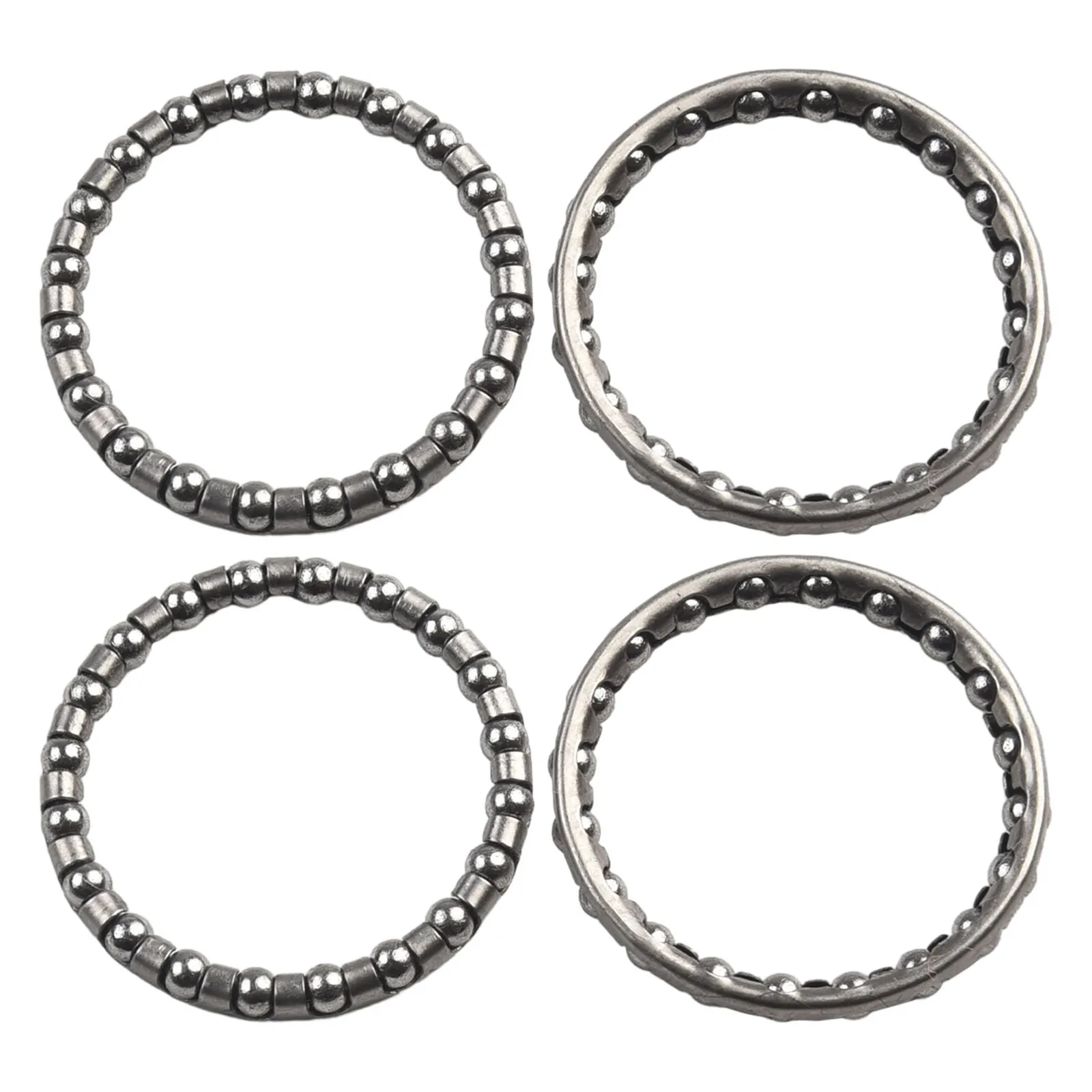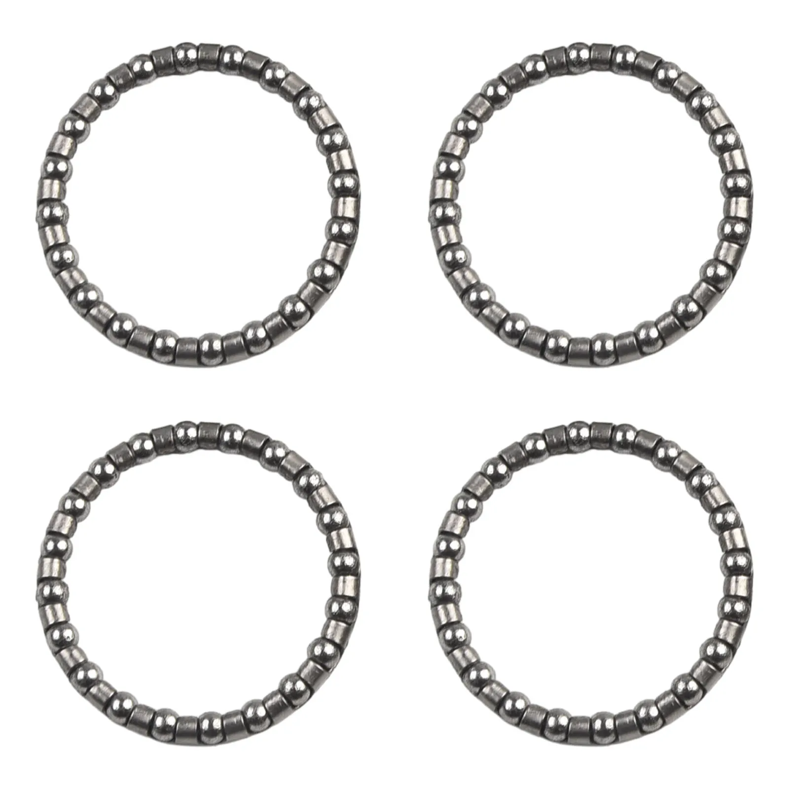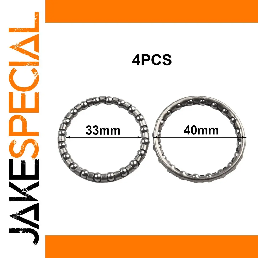 Experience seamless cycling with this high-quality set of four steel headset balls, designed for durability and precision. Crafted from resilient steel with a sleek, shiny silver finish, these spherical balls provide smooth performance and reliable operation for your bicycle's headset system. Sizes range from approximately 32mm to 40mm, fitting a variety of standard bicycle headsets. The balls are housed within textured metallic rings that complement their polished surface, offering an industrial yet minimalist appearance. Easy to install and built to last, this set ensures smooth steering and enduring performance on all your rides. Trust in these premium bearings for a smoother, safer cycling experience, whether you're commuting or hitting the trail.