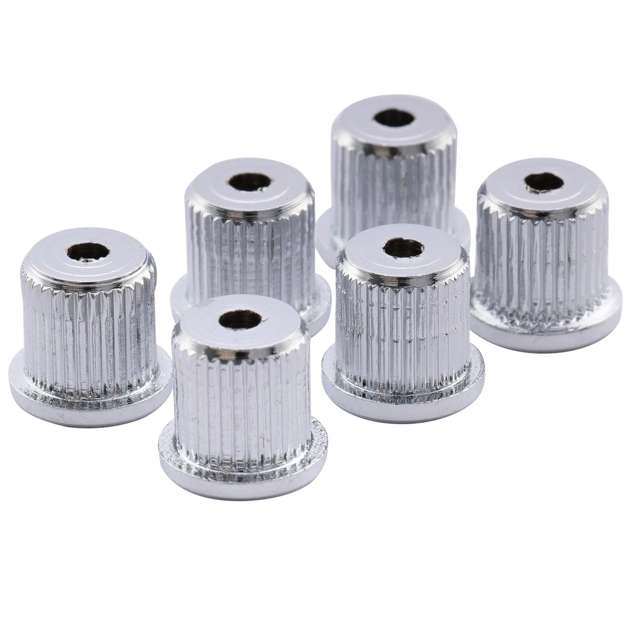 Experience the durability and sleek design of this set of six steel ferrules, perfect for guitar enthusiasts aiming for high-quality string-through-body installation. Crafted from durable steel, these ferrules feature a textured, ribbed exterior for enhanced grip and visual appeal. The polished, shiny top openings contrast with the textured sides, giving a modern, industrial look. Each ferrule has a flange diameter of 10mm and a height of 9.5mm, fitting seamlessly into an 8.2mm mounting hole. Available in several finishes like chrome, black, gold, and nickel, they add a touch of elegance to your guitar. Installing these ferrules ensures a secure, stable fit for your strings, enhancing both performance and aesthetics. Whether upgrading or building your guitar, these ferrules blend function with style, perfect for precision setup and professional sound.
