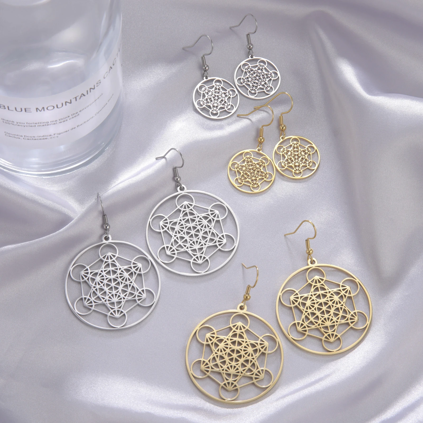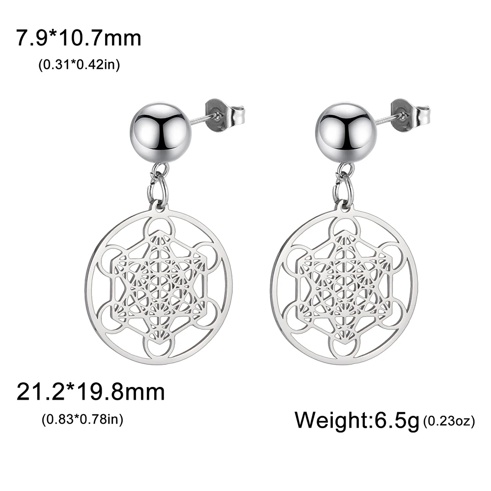 These stainless steel drop earrings feature the intricate Metatron’s Cube symbol, representing sacred geometry and universal forms. Available in two sizes—20mm and 38mm—with larger pendants measuring approximately 37.8 x 40.8 mm and smaller ones about 21.2 x 19.8 mm. Offered in steel and gold colors, they are hypoallergenic, resistant to fading and staining, and designed for women. Their lightweight, elegant design combines symbolic depth with modern style, making them perfect for daily wear or spiritual expression. Crafted with high-quality stainless steel, these earrings are a beautiful accessory that invites protection, power, and harmony into your life.
