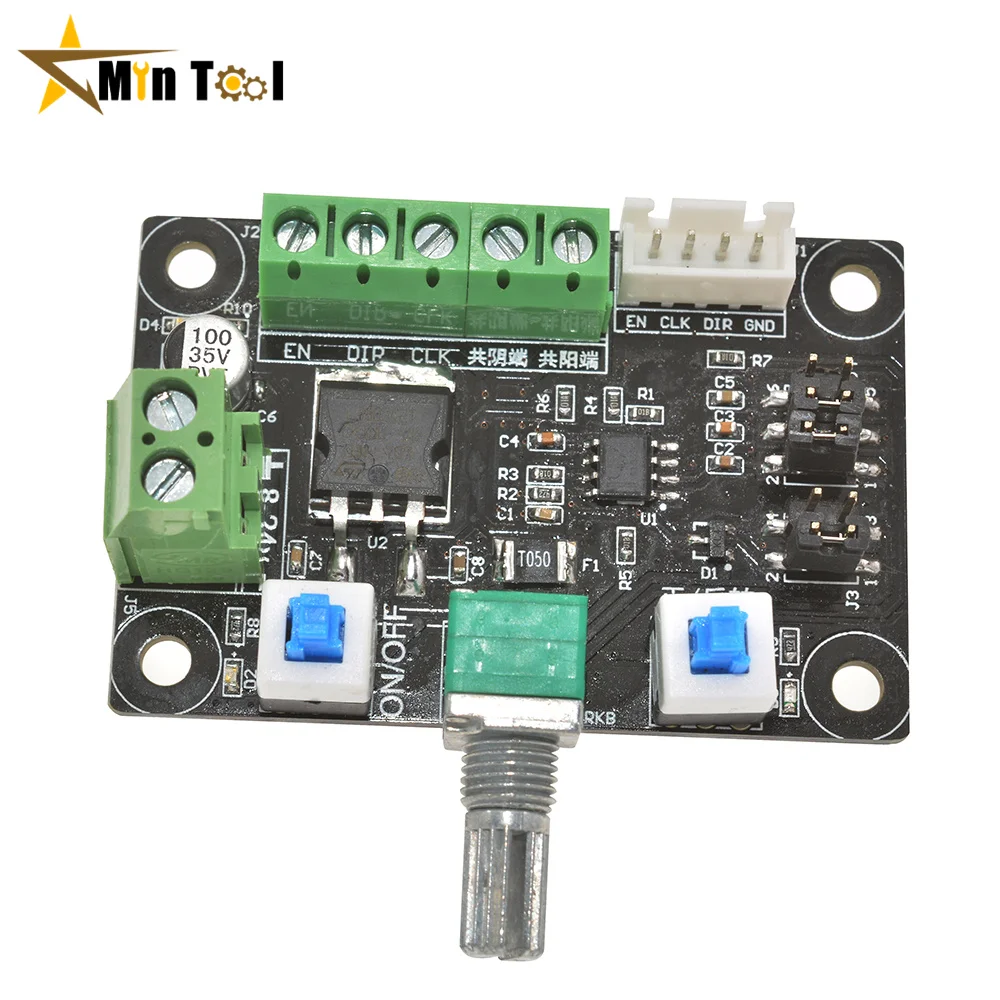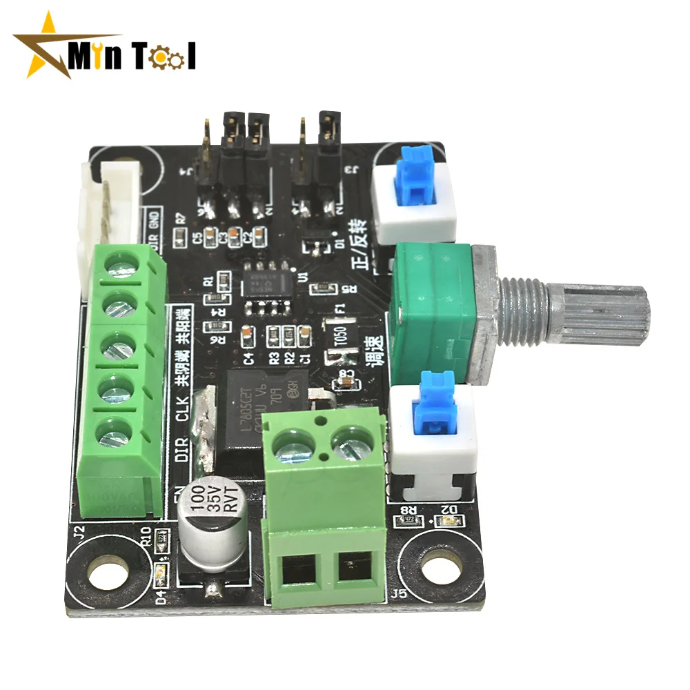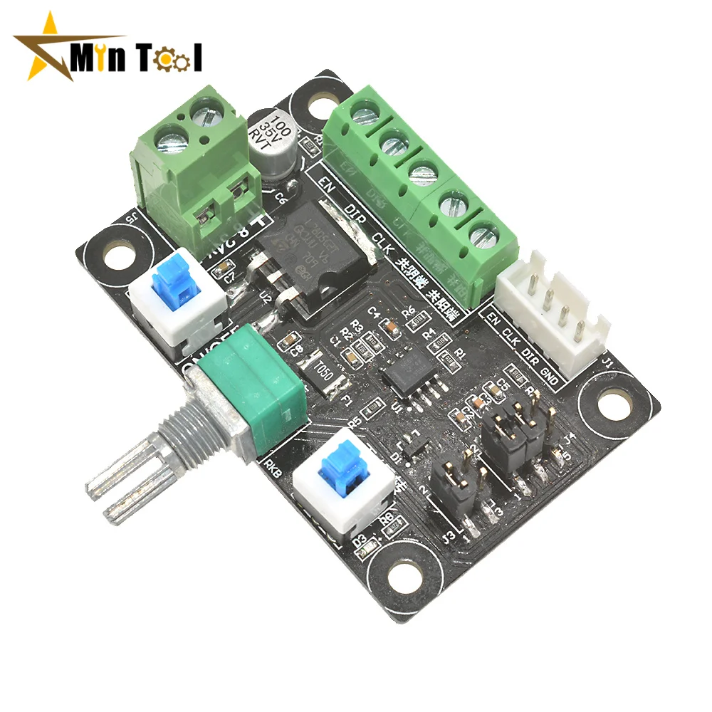 Enhance your stepper motor control with this versatile pulse signal generator and PWM speed controller module, compatible with 12V and 24V DC power supplies. Featuring three selectable frequency modes—high (5.4 kHz – 160 kHz), medium (540 Hz – 16.6 kHz), and low (80 Hz – 2.4 kHz)—configured via jumper, it allows precise speed regulation. Capable of producing pulse and PWM signals, it supports various stepper drivers and integrates connection points for enable, pulse, and direction signals, optimized for common anode wiring. Its compact, organized design with vibrant connection terminals makes it an essential tool for advanced stepper motor projects.
