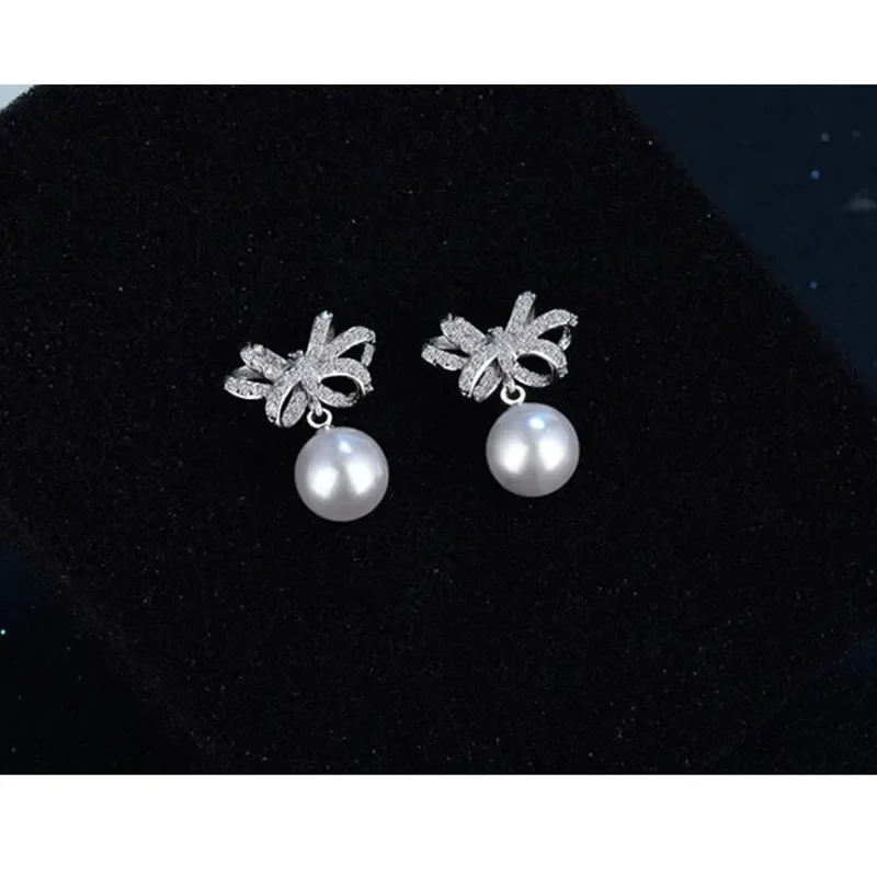 Experience timeless elegance with these stunning women's stud earrings, crafted from high-quality 925 sterling silver. Their delicate bowknot design is enhanced by sparkling cubic zirconia stones, adding a touch of brilliance and sophistication. Dangling gracefully beneath each bow is a luminous, white pearl, creating a perfect balance of modern sparkle and classic charm. Perfect for adding a feminine touch to any outfit, these earrings are versatile enough for day-to-night wear. The lightweight design ensures comfort with each wear, and the secure screw-back clasp provides peace of mind for everyday use. Elevate your jewelry collection with these trendy, eye-catching earrings that combine craftsmanship with timeless beauty.