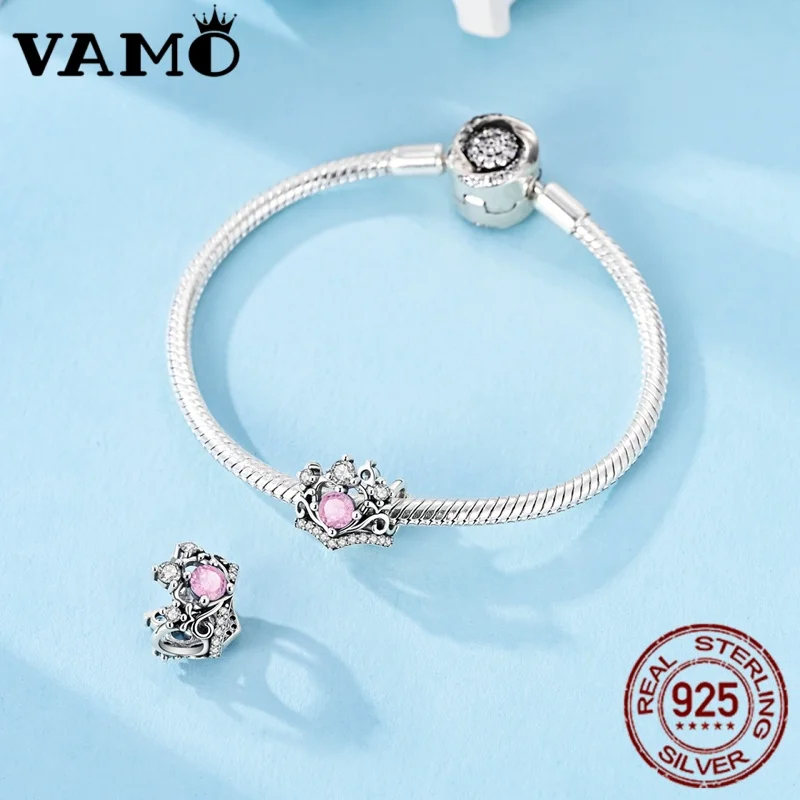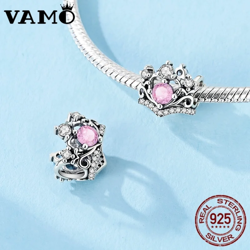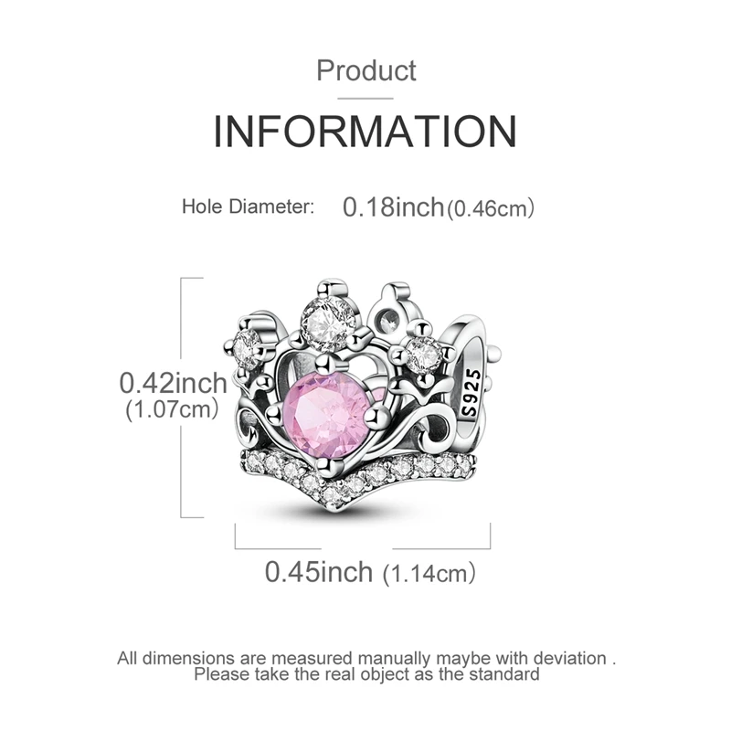 Imagine elevating your bracelet with this stunning crown-shaped charm bead, meticulously crafted from 925 sterling silver. Its compact nugget shape features intricate detailing, including delicate swirls and a lattice-like framework that evoke regal elegance. The centerpiece is a large, faceted pink cubic zirconia stone that captures light brilliantly, complemented by smaller sparkling clear cubic zirconia stones arranged around the crown motif. The polished silver surface highlights the detailed metalwork and shimmering stones, creating a luxurious look. Tiny stones are embedded into the silver band encircling the bead, adding extra brilliance. Perfect for adding a touch of royalty to your jewelry collection, this charm bead seamlessly combines sophisticated design with craftsmanship for an eye-catching adornment.