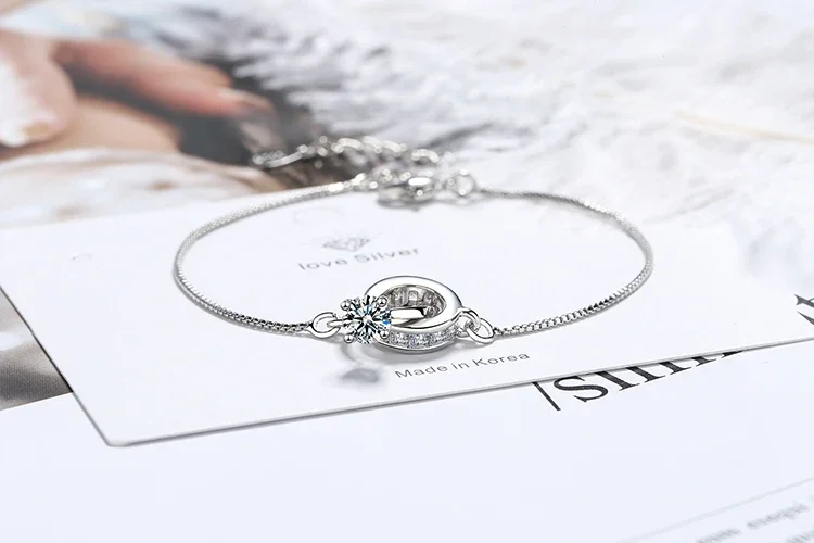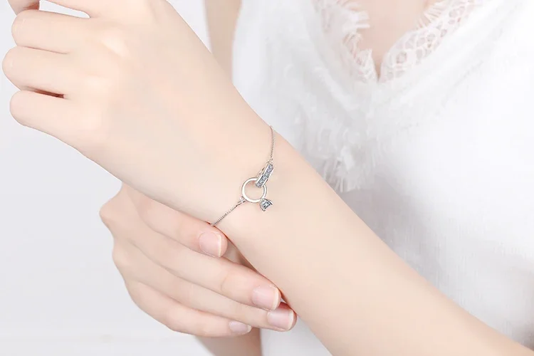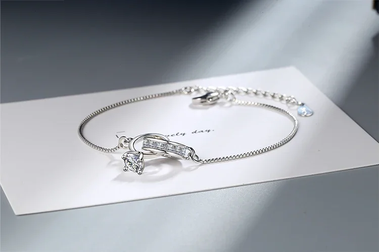 Step into timeless elegance with this meticulously crafted silver charm bracelet by ZSHANSGL. Designed for women who appreciate minimalist sophistication, it features a slender, polished sterling silver chain that reflects light beautifully, adding a refined touch to any outfit. The centerpiece showcases a modern double round circle motif, interlinked to symbolize unity and eternity. Delicately set along the horizontal bar of the main charm are sparkling micro zircon stones, offering subtle brilliance and texture. A tiny, faceted heart-shaped stone adds a romantic flair to the overall design. Perfect for special occasions like anniversaries, engagements, or as a heartfelt gift, this bracelet embodies grace and craftsmanship. Its versatile style complements both casual and formal looks, making it an essential accessory in your jewelry collection.