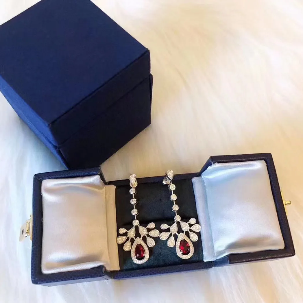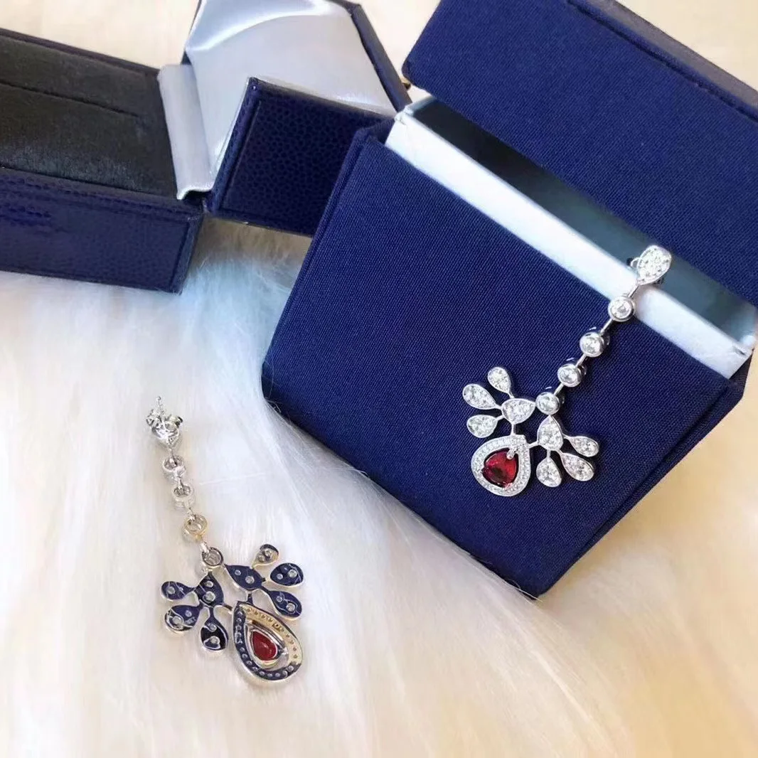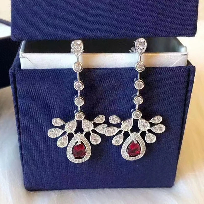 Experience the timeless beauty of this pair of elegant drop earrings crafted from genuine 925 sterling silver, polished to a stunning shine. The design features a delicate water-drop or leaf shape inspired by organic plant motifs, giving the earrings a graceful flow that enhances any outfit. The lower part showcases a large, deep red garnet stone, teardrop-shaped and full of rich color, creating a captivating focal point. Above the garnet, intricate silver foliage is adorned with tiny, sparkling micro-set zircon stones—adding texture, brilliance, and a touch of nature-inspired elegance. A slim line of round zircon stones runs vertically, connected by small silver links, completing this charming design. These earrings blend sophistication with a natural aesthetic, perfect for enhancing your style at any occasion.