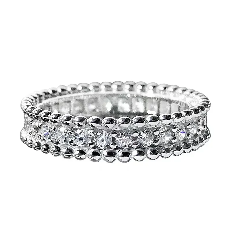 - One ring has a smooth, slightly rounded band encrusted with small zircon stones along the top, providing a subtle shimmer suitable for daily wear or formal events.