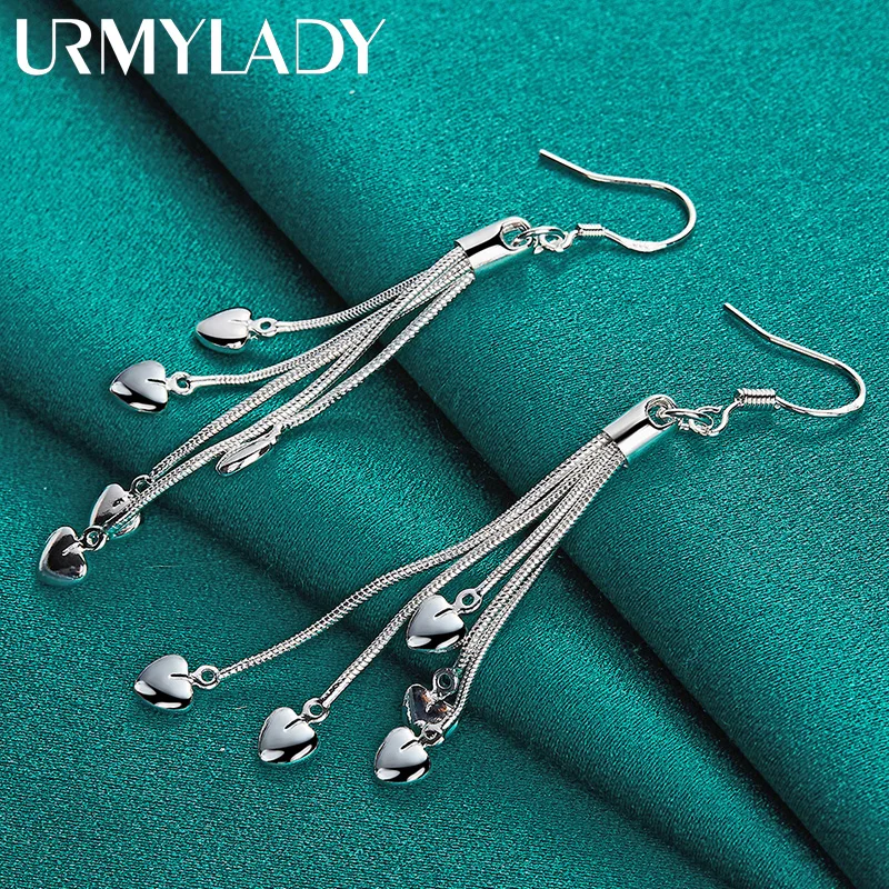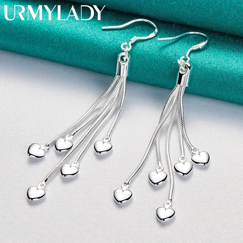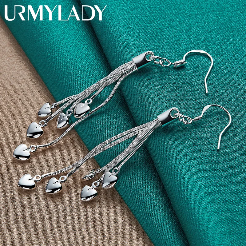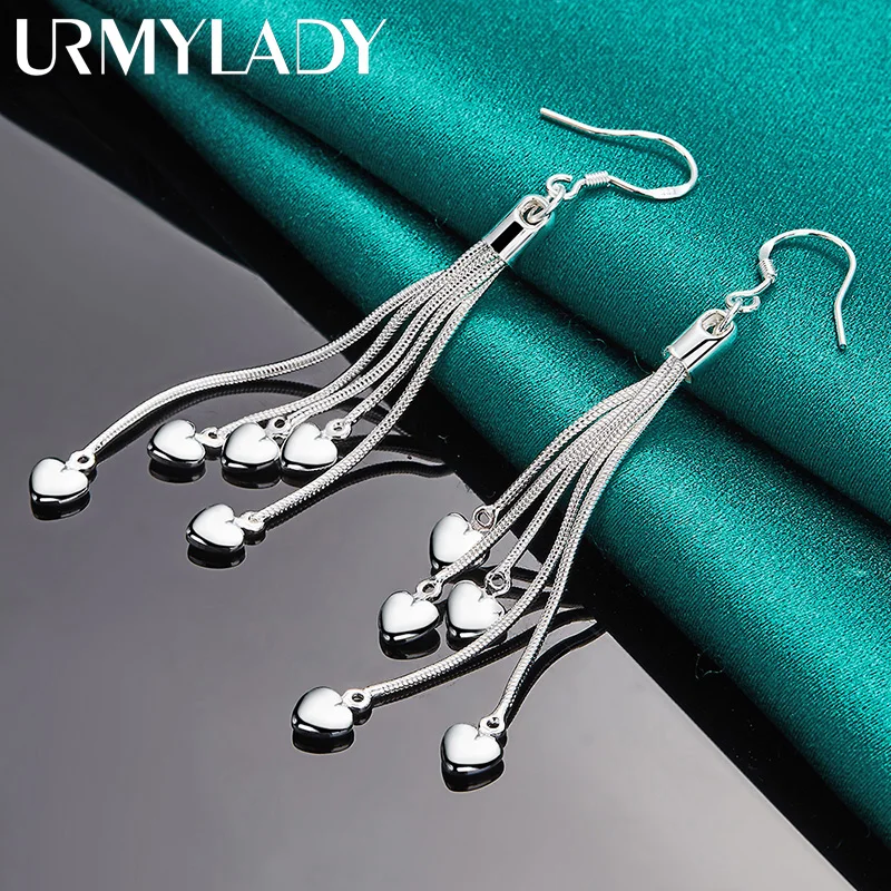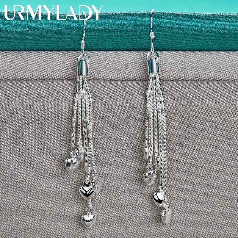 Elevate your elegant look with these URMYLADY 925 Sterling Silver Tassel Heart Drop Earrings, weighing approximately 8 grams. Crafted from polished sterling silver stamped with 925, these fine jewelry pieces feature a classic heart-shaped top with a romantic, flowing tassel design. Delicately dangling chains with small rounded charms create a graceful, layered silhouette perfect for engagement, wedding, or special occasions. The sleek, shiny finish reflects light beautifully, adding a feminine touch to your attire. Designed for women, these timeless earrings combine modern sophistication with romantic charm, ensuring you’re beautifully accessorized for memorable moments.