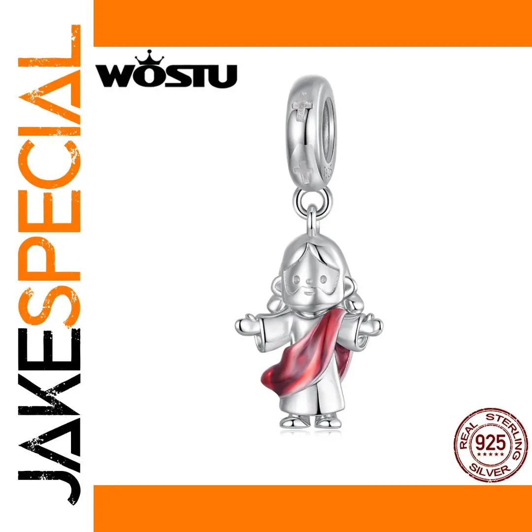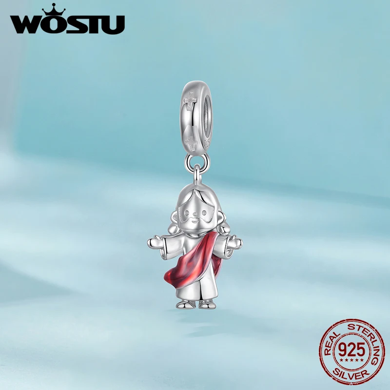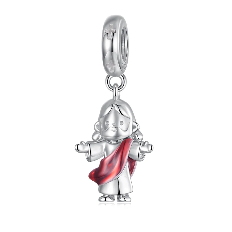 This elegant religious Jesus charm pendant crafted from 925 sterling silver measures 2.5 x 1.1 cm and weighs 2.2 grams. It features a polished silver finish, a vibrant red enamel sash, and a sparkling zircon stone near the top. The stylized, cartoon-like Jesus figure displays simple facial features and gentle folds in the robe, exuding a friendly and welcoming appearance. Designed with a sturdy loop for easy attachment, this fine jewelry bead is ideal for DIY jewelry projects, gifts, or commemorative occasions such as baptisms and first communions. Certified and crafted with high-quality materials, it perfectly combines subtle details with vibrant color and brilliance.