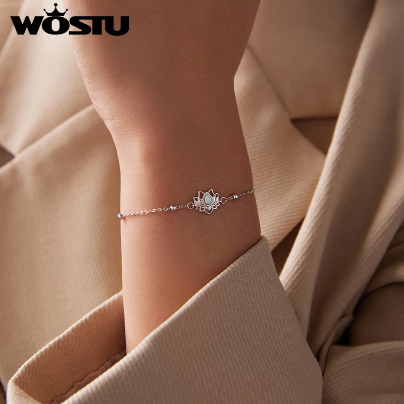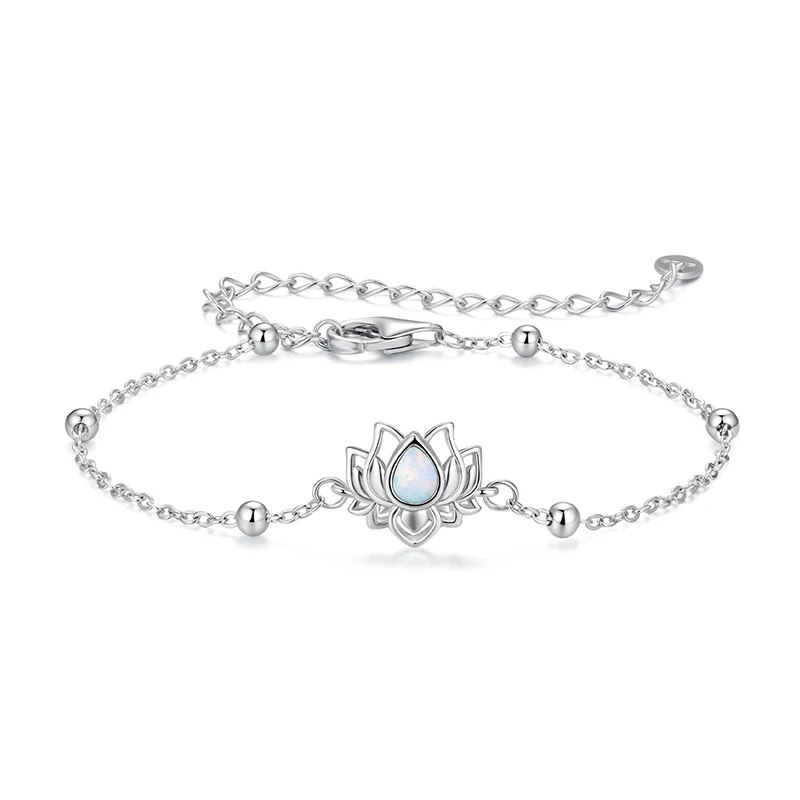 Step into a world of refined elegance with this stunning sterling silver bracelet designed to highlight your natural beauty. Crafted from polished 925 sterling silver with a bright, reflective finish, this delicate piece embodies sophistication and grace. The slender chain, measuring 0.25cm in thickness and extendable to 210mm, offers a comfortable fit while emphasizing its fine craftsmanship. The centerpiece features an openwork lotus flower motif, symbolizing purity and rebirth, crafted with airy, petal-like details. At its core, a teardrop-shaped synthetic opal displays a captivating iridescent glow, blending white with subtle hints of blue and pink. Perfect for special occasions, this jewelry adds a luminous touch to your ensemble and makes an unforgettable gift.