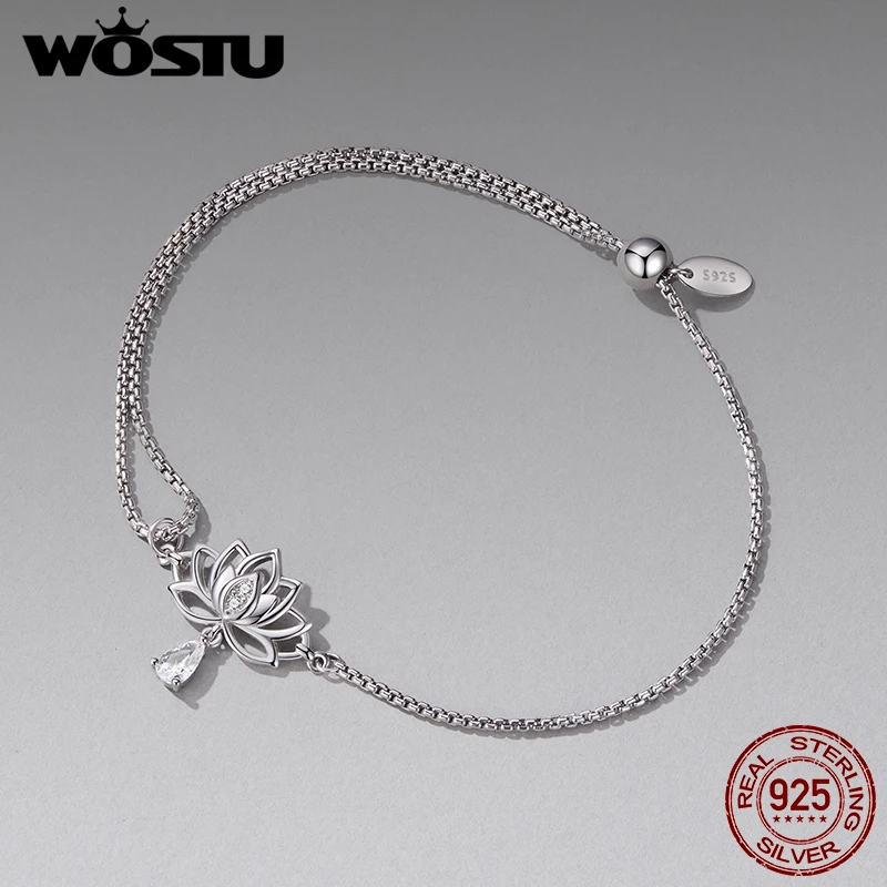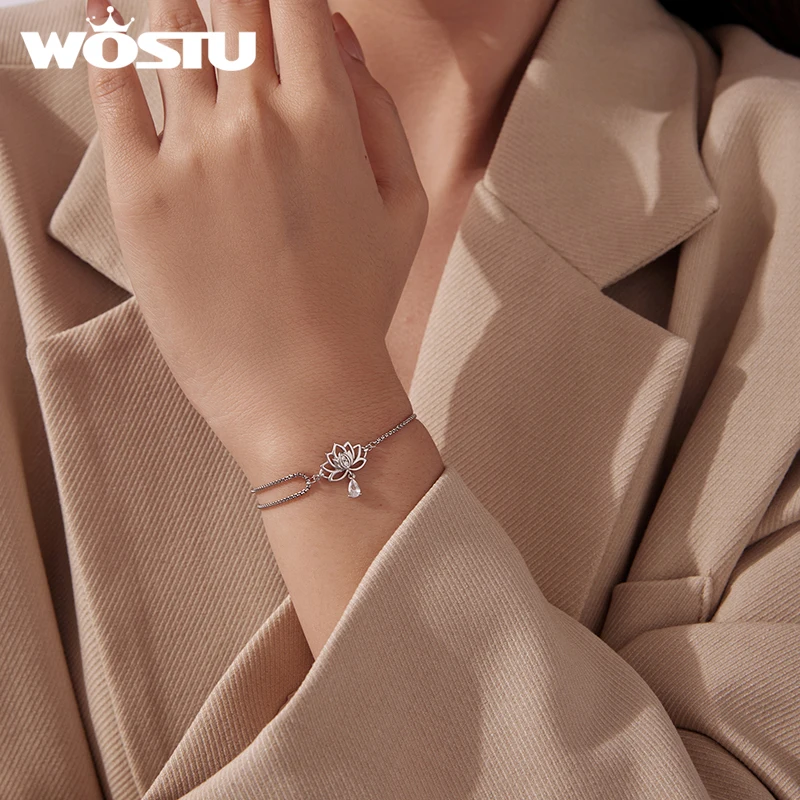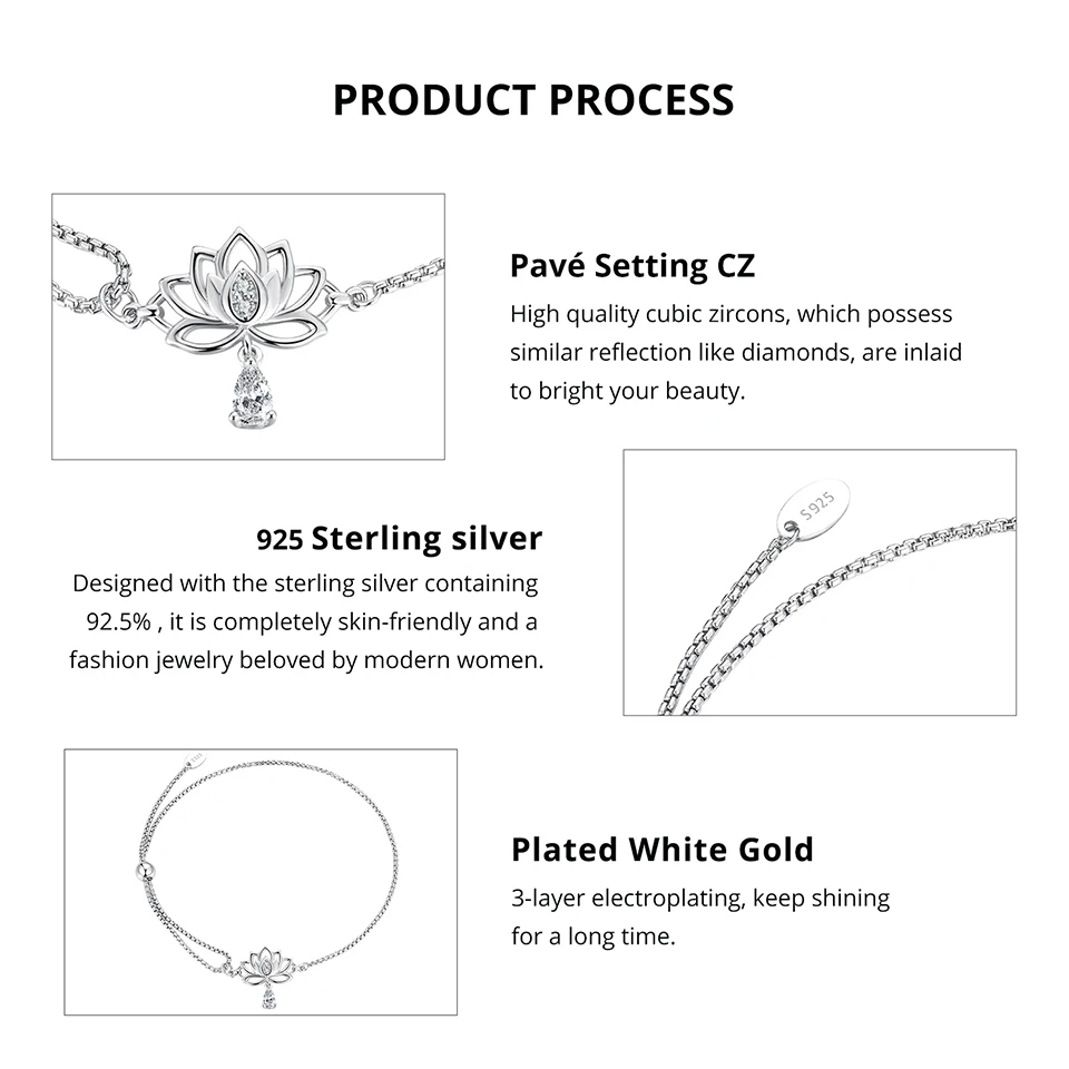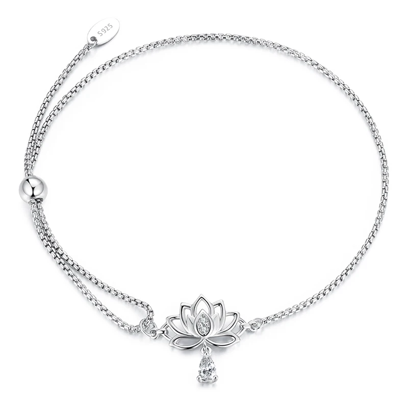 Imagine yourself wearing this exquisite minimalist jewelry piece that beautifully combines elegance with subtle symbolism. Crafted from 100% sterling silver and finished with a sleek white gold tone, this bracelet features a delicately detailed lotus flower as its focal point. The flower’s overlapping petals are smooth and polished, enhancing its modern and refined appeal. Embedded at the center of the lotus is a sparkling cubic zirconia stone set in pavé style, adding a touch of brilliance. Dangling from the flower is a teardrop-shaped zirconia that enhances movement and eye-catching sparkle. With a 23cm adjustable chain, this trendy bracelet offers perfect comfort and versatility, ideal for both everyday wear and special occasions.