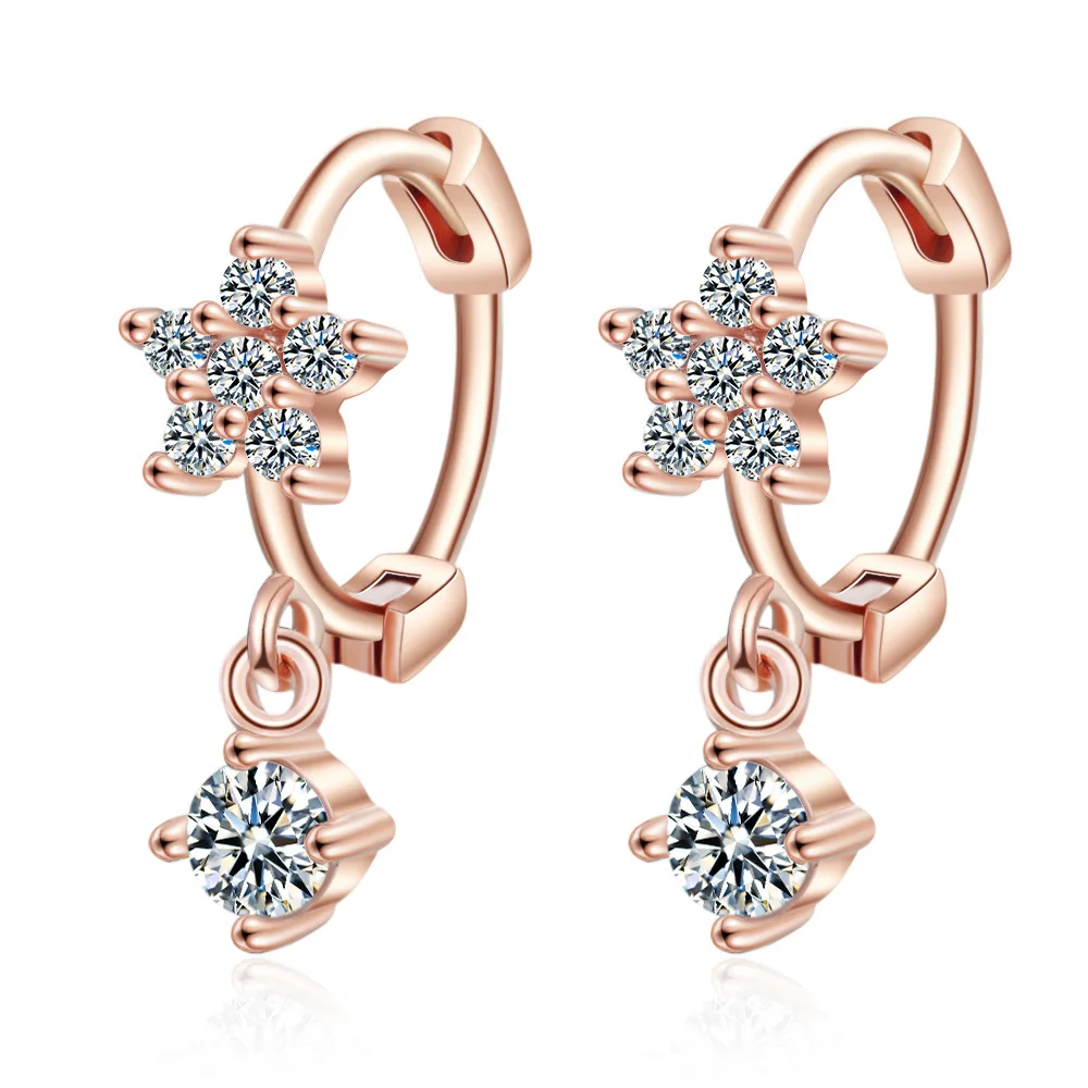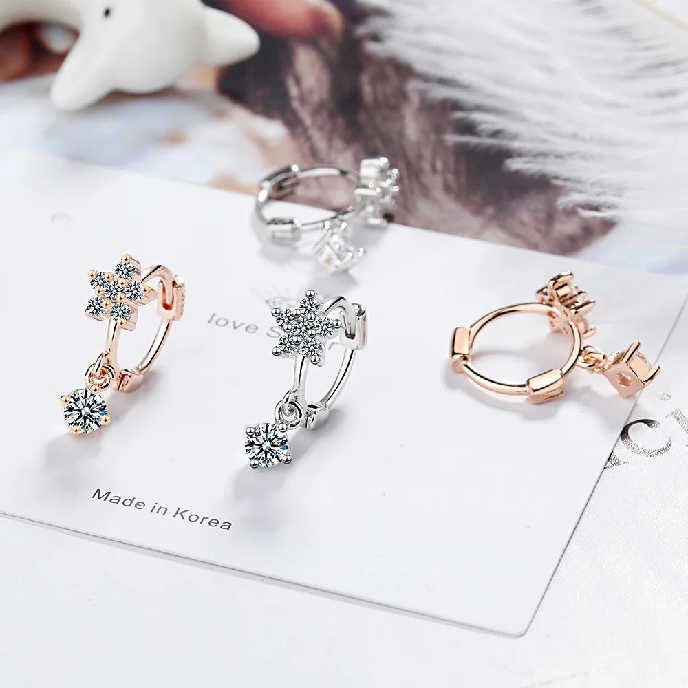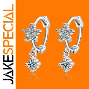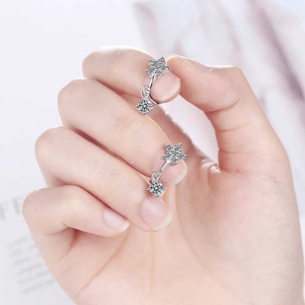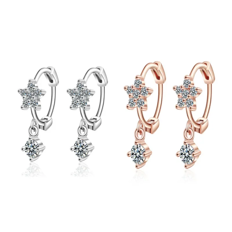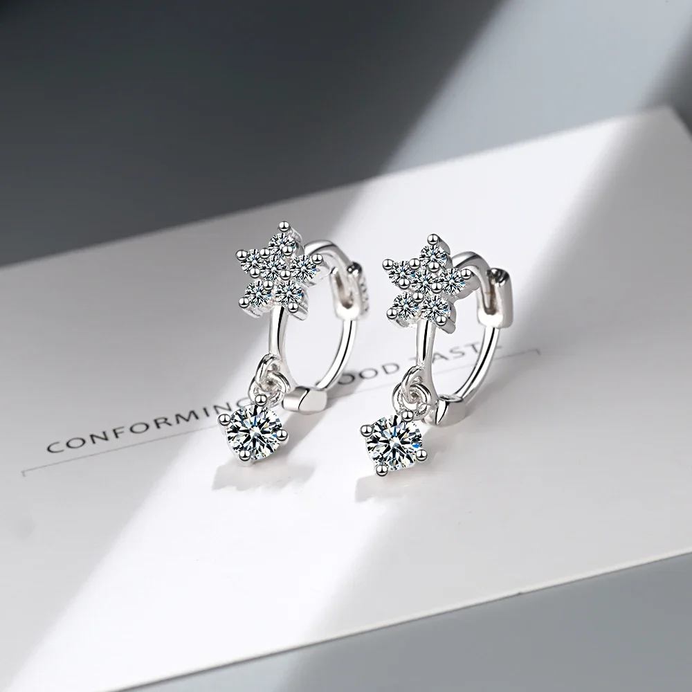 Discover the timeless charm of these beautifully crafted earrings, designed to add a touch of sophistication to any outfit. Made from high-quality 925 sterling silver, these earrings feature a sleek geometric hoop shape that is both modern and delicate. Adorned with five sparkling zircon crystals in a star-shaped cluster, they create a radiant shimmer that mimics the brilliance of diamonds. A larger zircon hangs gracefully from the bottom, catching light from every angle. Their lightweight design—around 2 grams each—ensures comfortable wear, perfect for daily or special occasions. Whether you're dressing for a party, the office, or a romantic date, these earrings embody simplicity and elegance, making them a versatile addition to your jewelry collection.