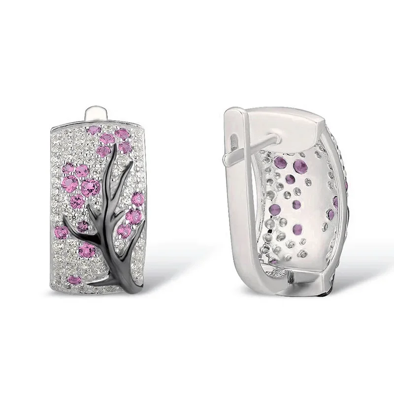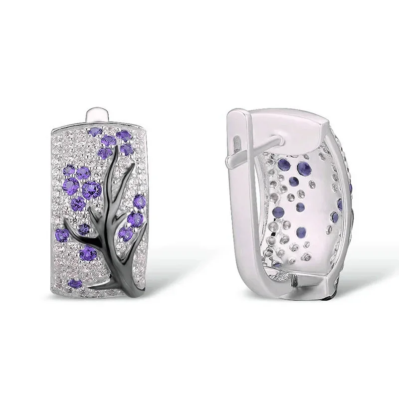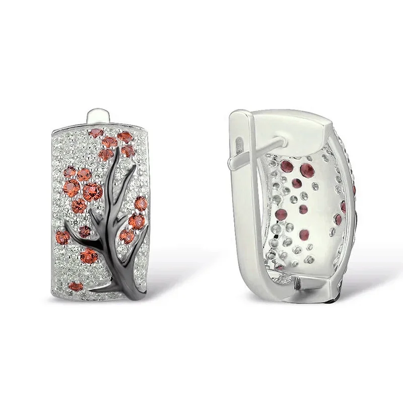 Immerse yourself in the sophisticated charm of these beautiful earrings, crafted from genuine 925 sterling silver. Weighing approximately 3.5 grams, they feature a sleek, geometric rectangular shape with rounded edges that exude modern elegance. The surface is densely encrusted with sparkling zircon stones in vibrant colors including blue, green, orange, pink, purple, and rose red, creating a dazzling textured background that captures light from every angle. Overlaid on this glittering surface is a dark silver branch or tree motif, delicately extending diagonally and adding a nature-inspired touch. Bright zircon stones resemble blossoms or berries, adding lively pops of color for a perfect finishing detail suitable for any occasion, from parties to professional events.