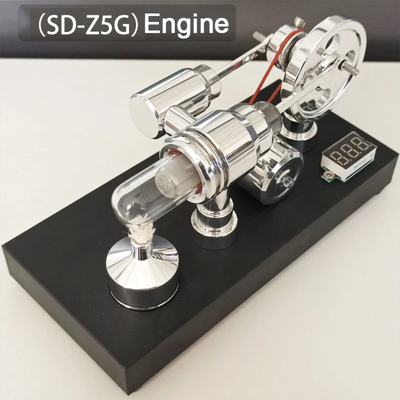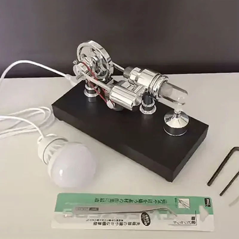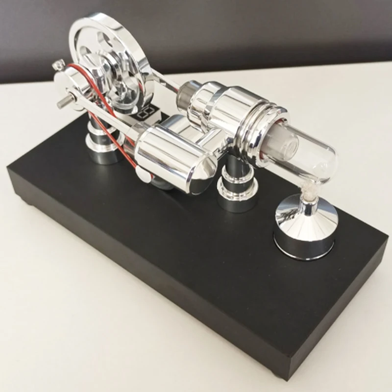 Experience the precision and elegance of the Stirling Engine Generator Model, featuring a sleek 1:48 scale double-cylinder design measuring 8 x 17 x 9.5 cm and weighing 480 grams. Constructed from quartz, aluminum alloy, and mirror-polished metals, it showcases transparent glass heating cylinders and meticulously machined connecting rods. The black plastic base with sandblasted surface hosts an integrated voltmeter and USB port, enabling power output. Powered by an alcohol lamp (not included) with recommended purity of 75% or higher, this model offers a captivating physics experiment or creative gift, ideal for enthusiasts aged 14 and above, combining advanced craftsmanship with an engaging demonstration of thermal-to-mechanical energy conversion.
