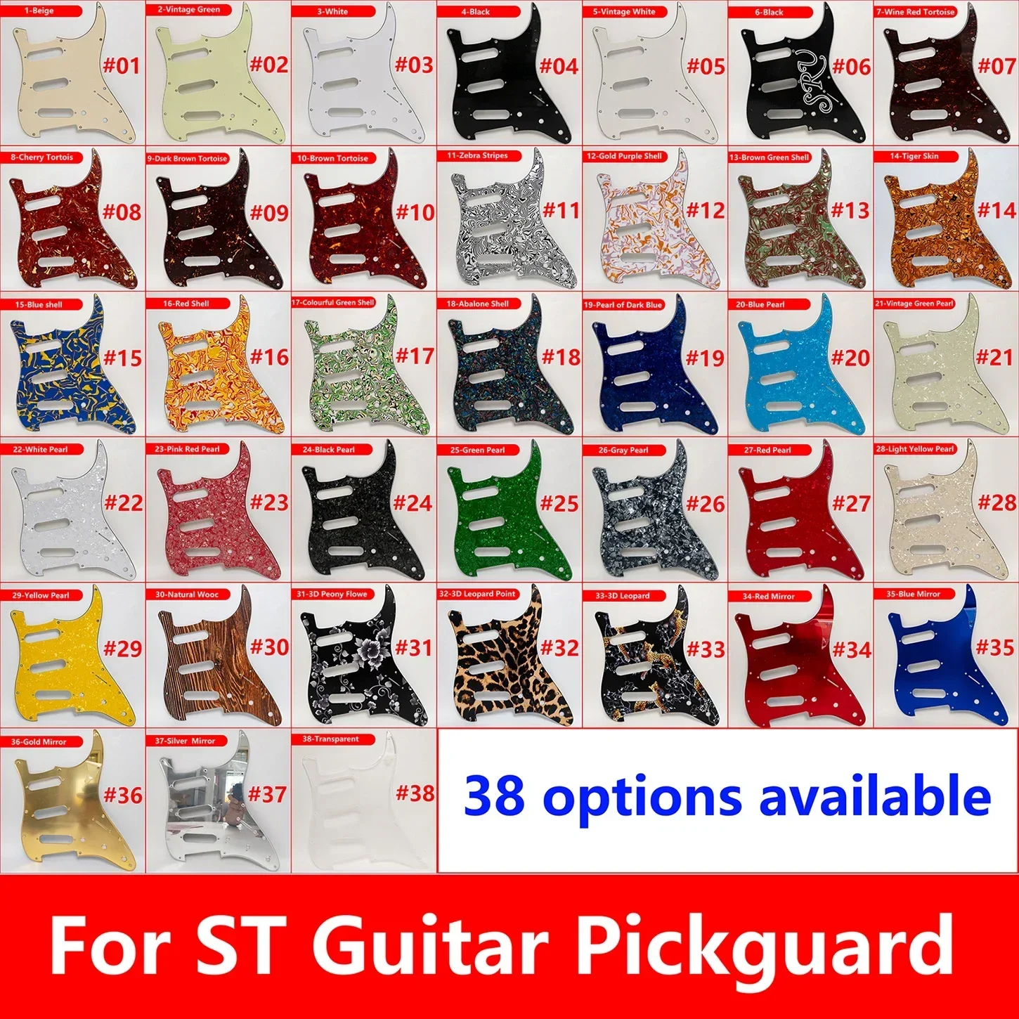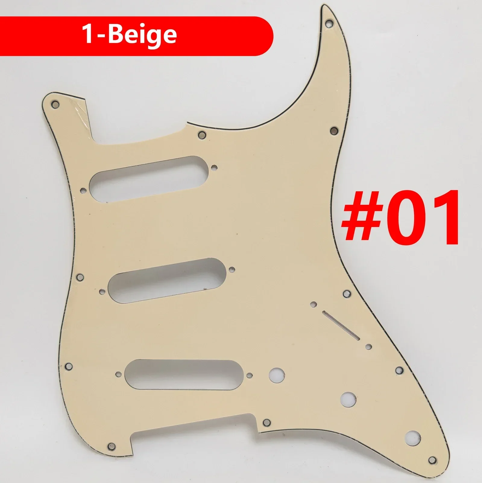 - The pickguard features multiple mounting holes with metallic ring inserts, compatible with U.S./Mexican Strat-style guitars and custom color options including a standard light yellow.