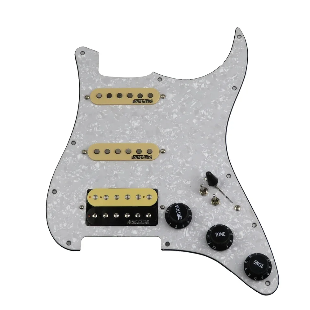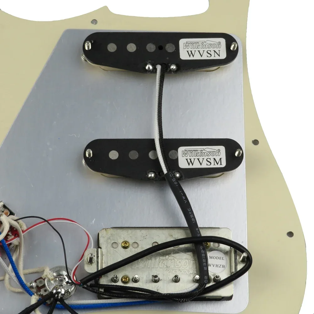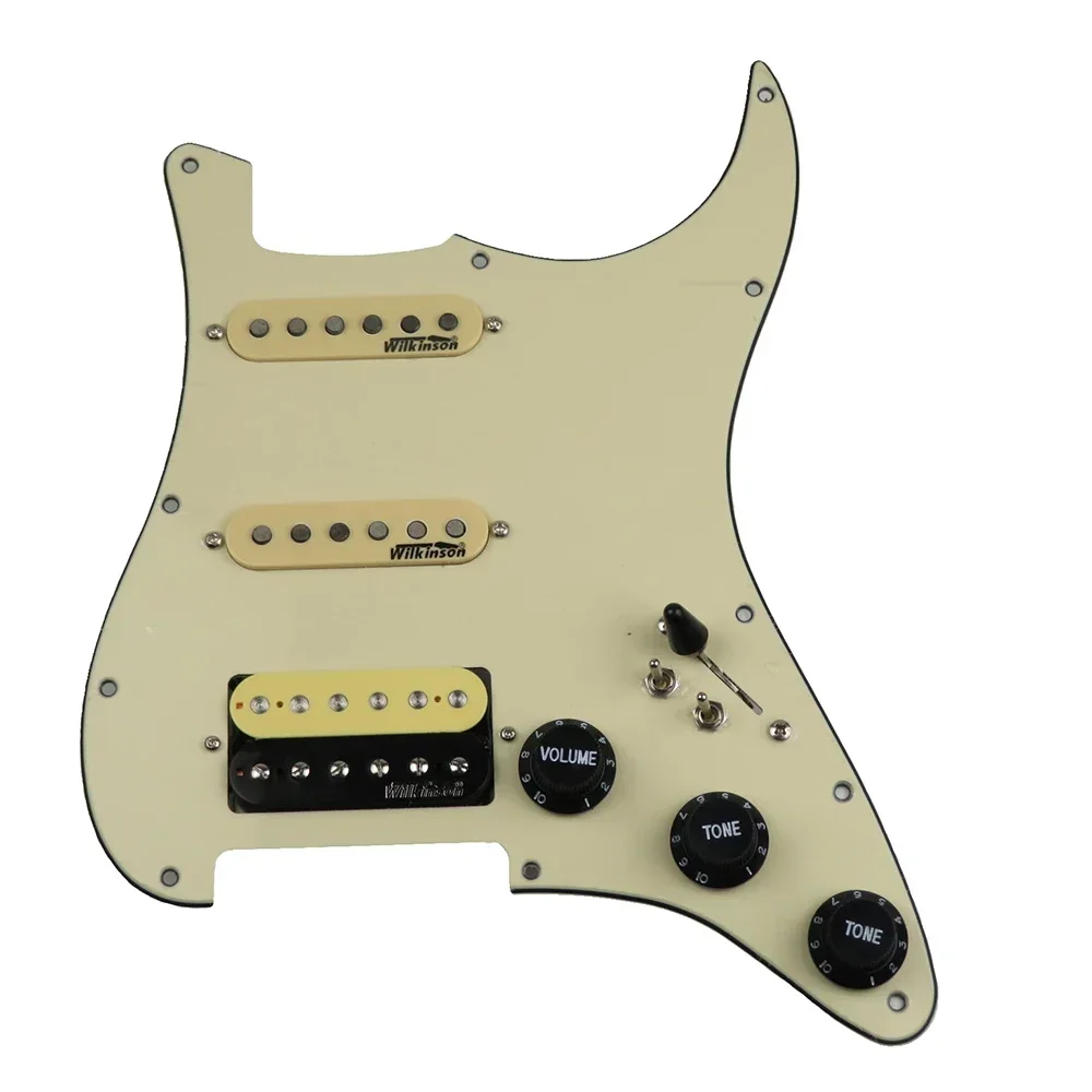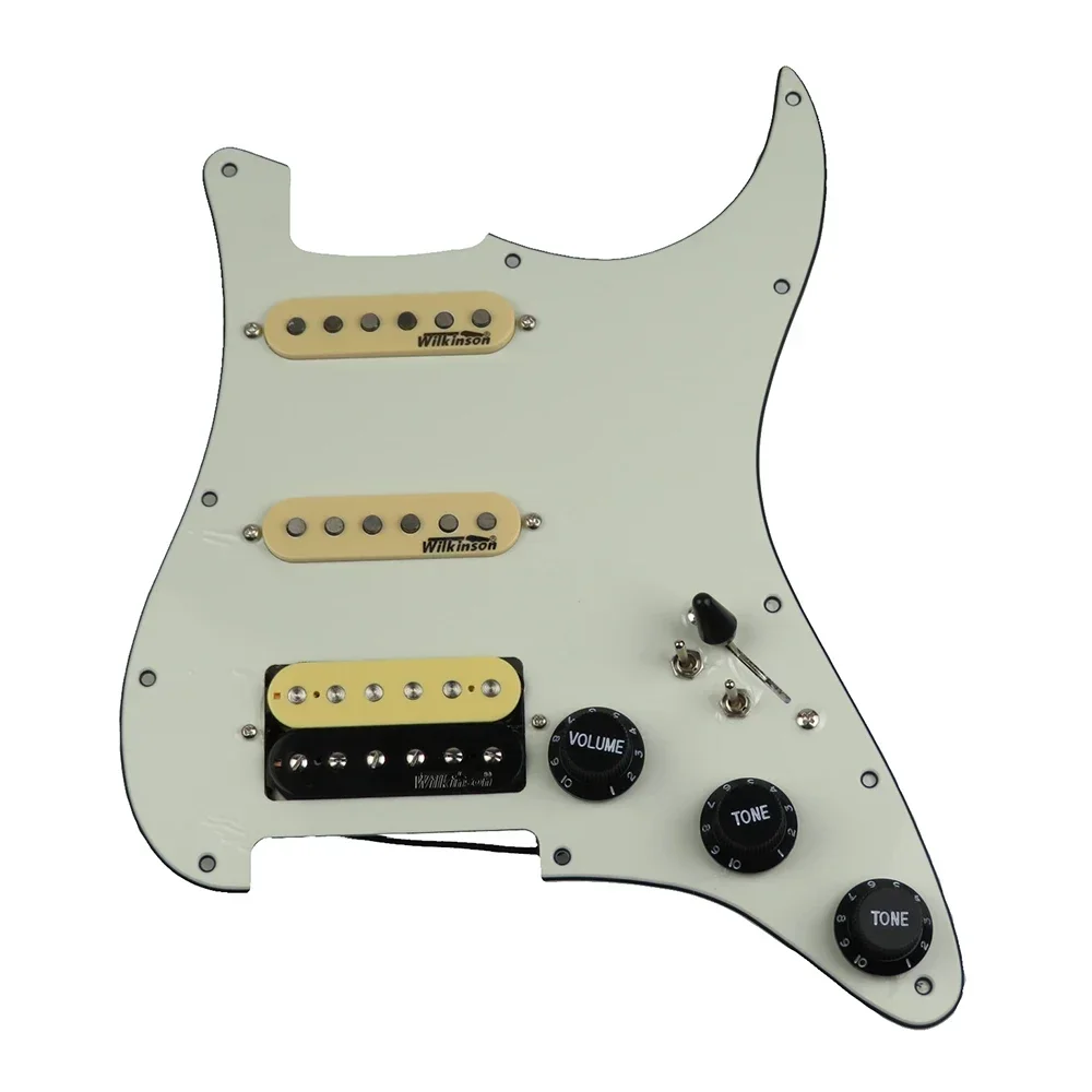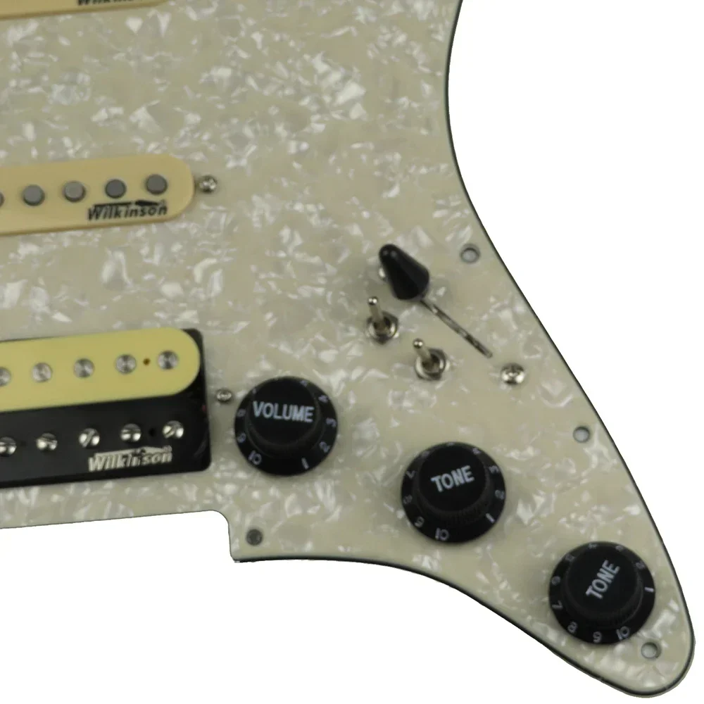 Experience a seamless upgrade with this fully assembled, prewired guitar pickguard designed specifically for Strat-style guitars. Crafted to deliver versatile tones, it features a sophisticated 7-way switching system, allowing you to easily switch between series, single-coil, and humbucking options. Its high-quality Wilkinson pickups—neck and middle at 6.5K ohms with Alnico 6.5 magnets, and a powerful 14.5K ohm bridge with staggered pole pieces—ensure balanced output and maximum tonal potential. The innovative mid pickup reduces hum, providing a clean, focused sound. Complete with durable parts, including 500K volume pots, a precision capacitor, and a 5-way switch, this pickguard guarantees reliable performance. Its vintage aesthetic with pearl-like finish adds an elegant touch to your guitar, making every performance memorable.