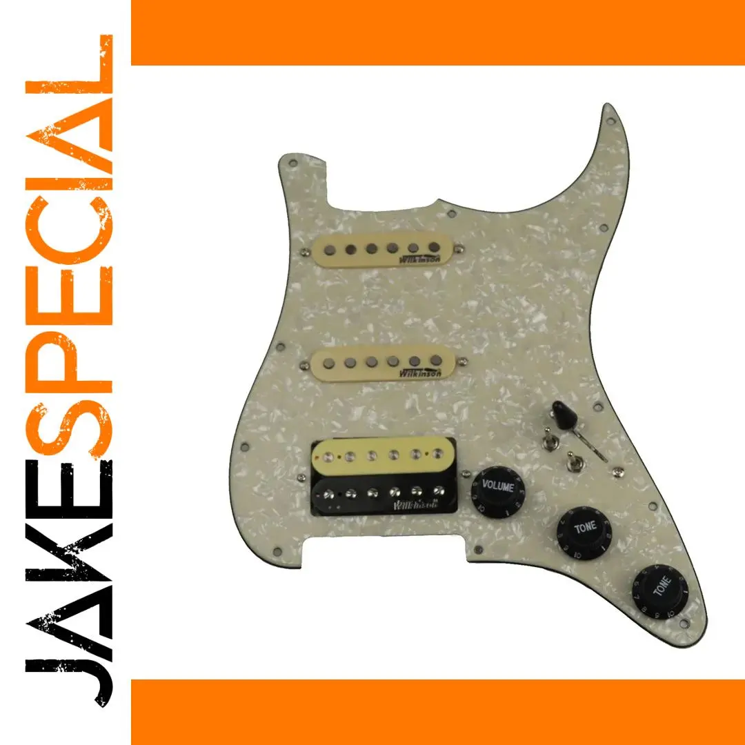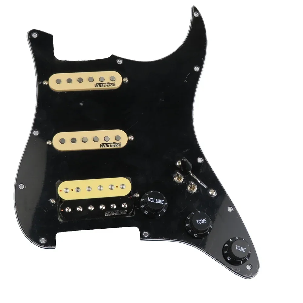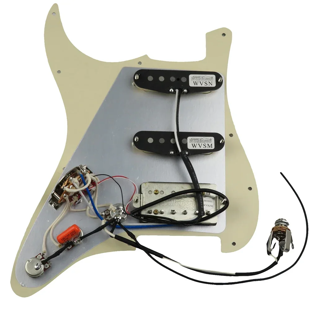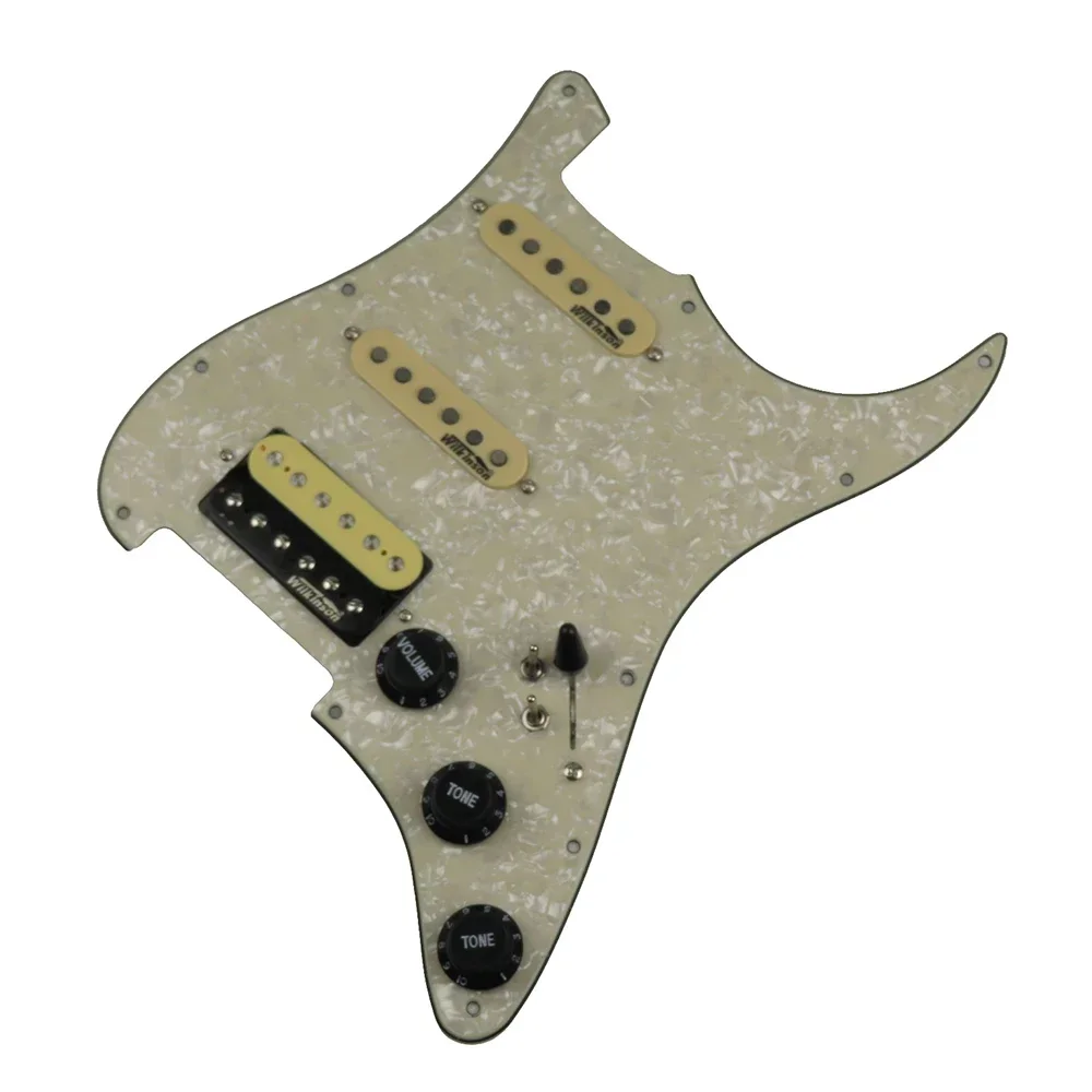 Experience a seamless upgrade with this fully assembled, prewired guitar pickguard designed specifically for Strat-style guitars. Crafted to deliver versatile tones, it features a sophisticated 7-way switching system, allowing you to easily switch between series, single-coil, and humbucking options. Its high-quality Wilkinson pickups—neck and middle at 6.5K ohms with Alnico 6.5 magnets, and a powerful 14.5K ohm bridge with staggered pole pieces—ensure balanced output and maximum tonal potential. The innovative mid pickup reduces hum, providing a clean, focused sound. Complete with durable parts, including 500K volume pots, a precision capacitor, and a 5-way switch, this pickguard guarantees reliable performance. Its vintage aesthetic with pearl-like finish adds an elegant touch to your guitar, making every performance memorable.
