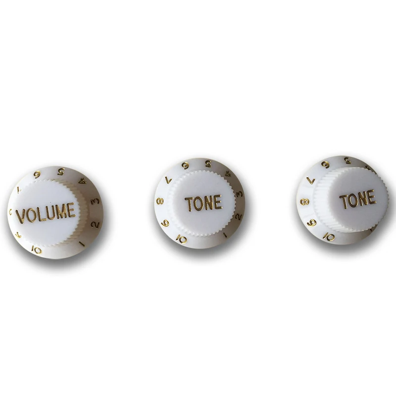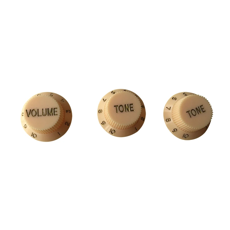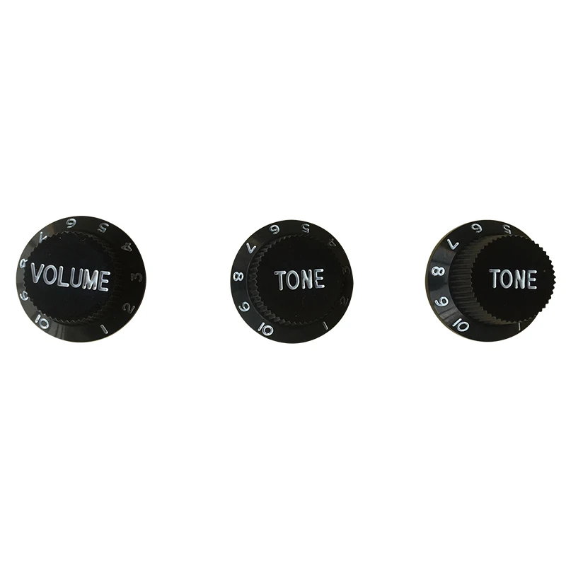 Enhance your Stratocaster-style electric guitar with this set of three custom control knobs, including one volume and two tone knobs, designed for universal fit on split pot shafts with a diameter of approximately 25.5mm and a height of 13mm. Crafted from durable PVC, these push-on knobs require no screws and are compatible with both coarse and fine-knurled (Alpha or CTS) shafts. Featuring a sleek cylindrical shape with textured sides for grip and glossy finishes, they come in a variety of vibrant colors such as dark blue, metal black, mint green, black, white, sky blue, cream yellow, parchment, and pink. Perfect for upgrading or replacing aged or dingy controls on Stratocaster or SQ electric guitars.
