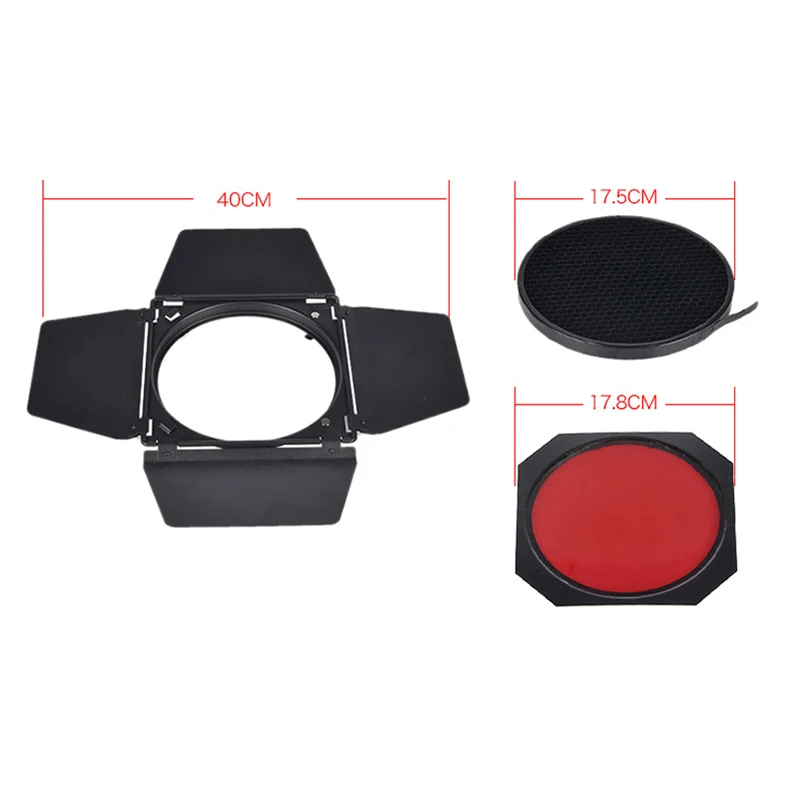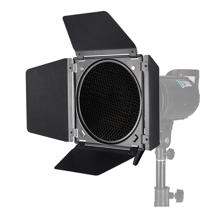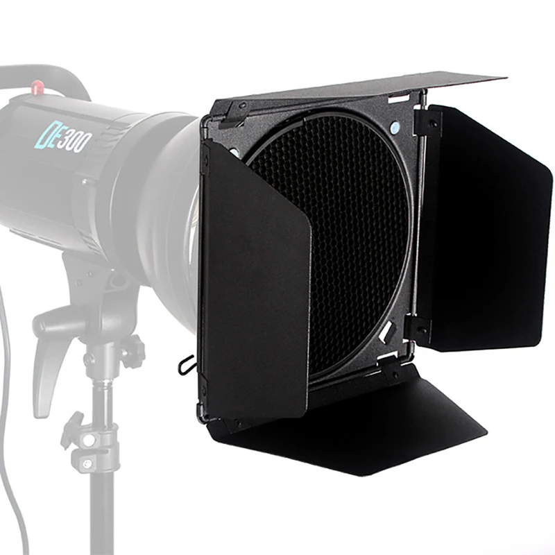 Enjoy precise lighting control with this stylish barn door accessory, perfect for enhancing your photography setup. Designed for standard reflectors, it features hinged black panels that extend outward, allowing you to shape and direct light with ease. The set includes a honeycomb grid to focus the light beam sharply, reducing spills and creating dramatic effects. Additionally, four vibrant color gel filters—red, blue, yellow, and green—are included, enabling creative color adjustments. Weighing only 950 grams, this lightweight, durable accessory is easy to handle and ideal for professional and hobbyist photographers alike. The sleek matte black finish complements any studio environment, providing both functionality and modern aesthetic appeal.