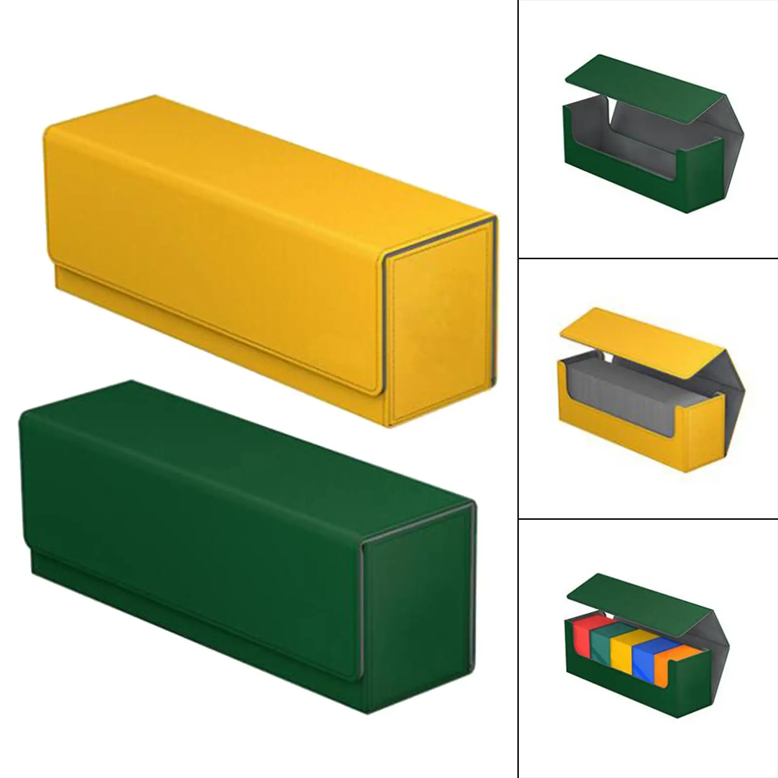 Imagine having a sleek, durable storage solution that keeps your collectible cards organized and protected. This high-quality PU leather box is designed to hold up to 400 cards, making it perfect for avid collectors. Its minimalist yet modern design features smooth, uniform surfaces with rounded edges for a refined appearance. Available in vibrant green and yellow, the box adds a pop of color to your collection while ensuring each card stays free from bending, fading, and scratches. The subtle darker accents along the edges enhance its sophisticated look. An accessible closure mechanism allows you to quickly access or store your cards, keeping everything tidy and within reach. Whether you’re a seasoned collector or a casual enthusiast, this box elevates your collection storage to a new level of style and function.