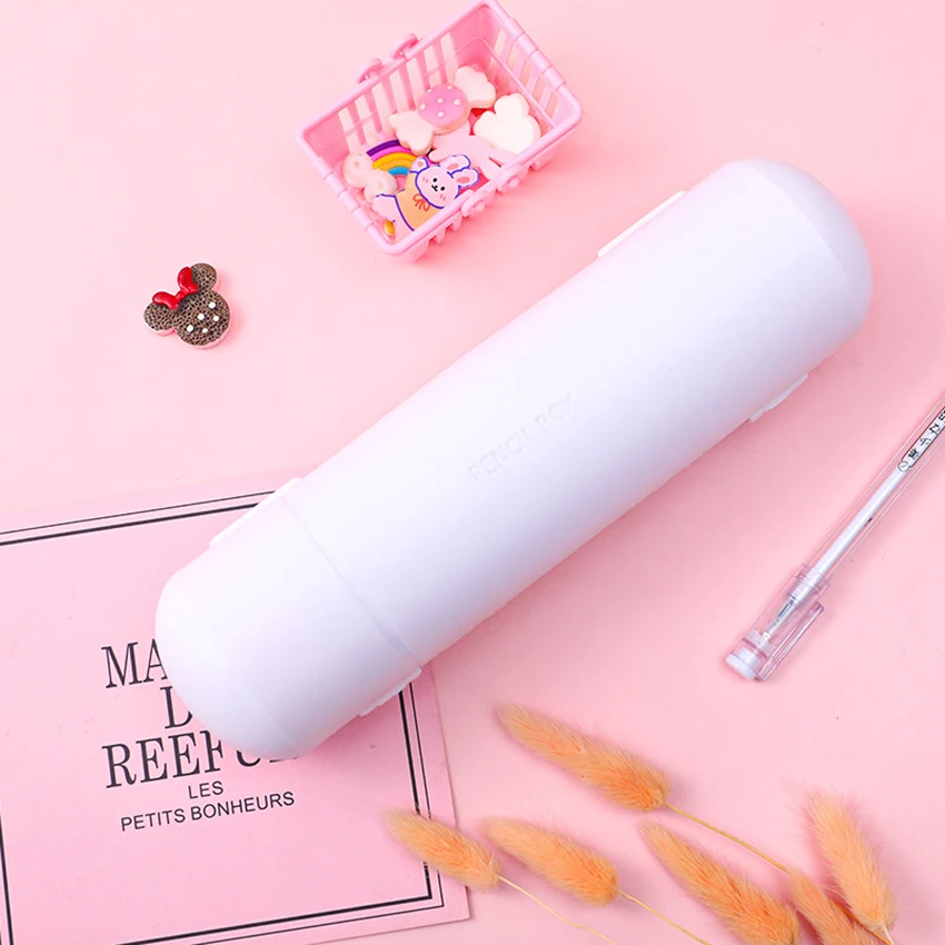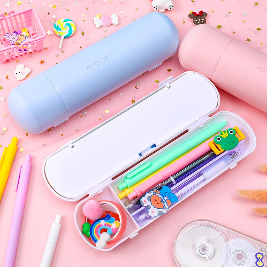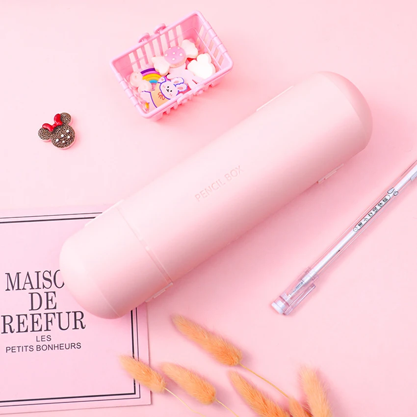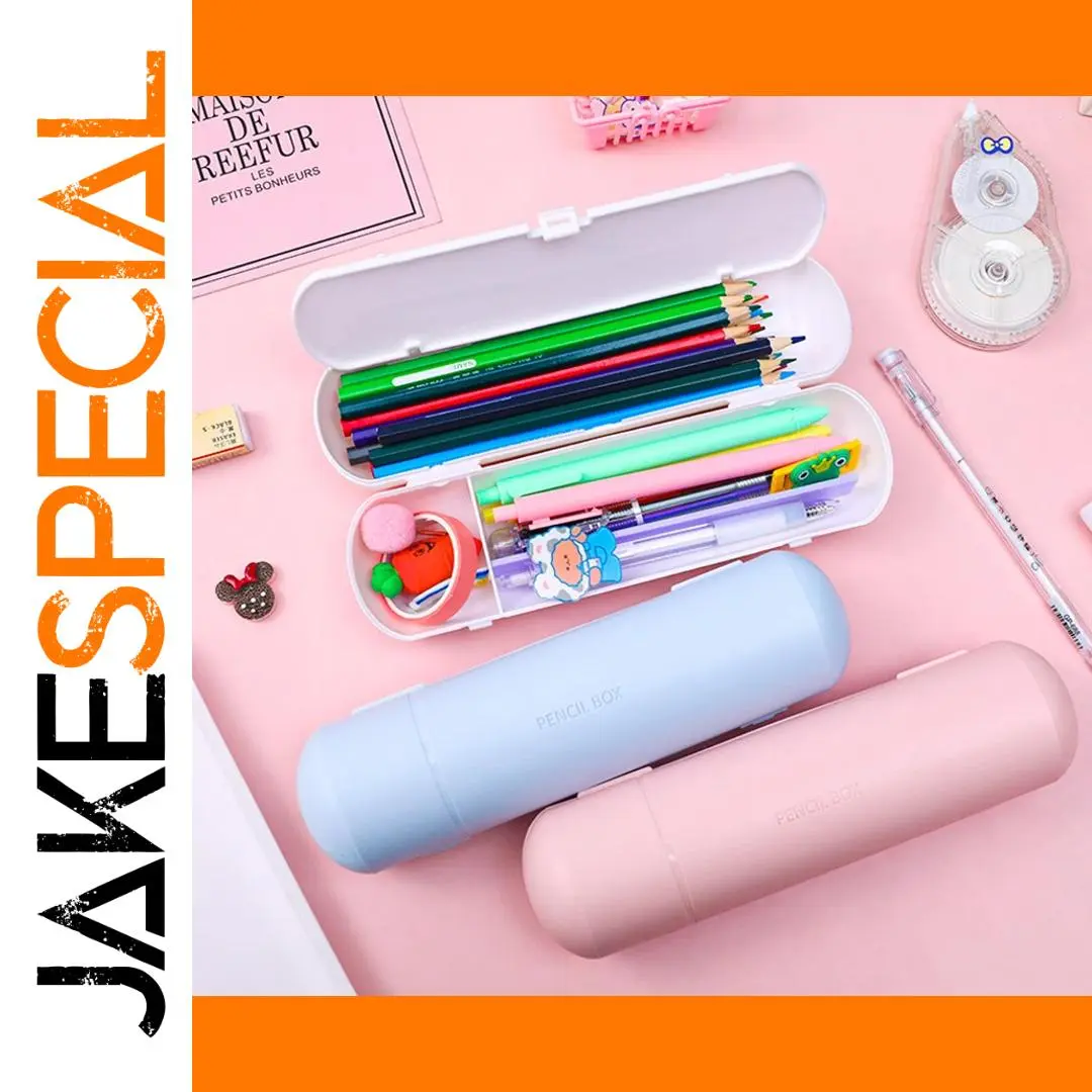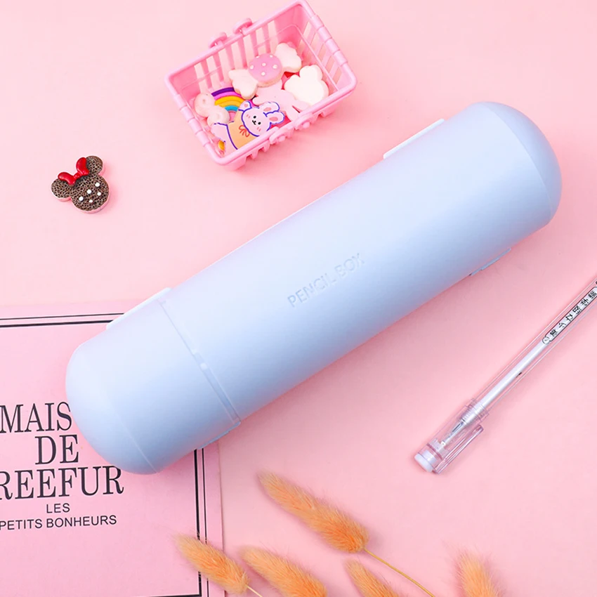 Experience organized and vibrant school days with this large-capacity, double-layer cylindrical pencil case. Crafted from durable plastic, it features a sleek matte finish in soft pastel colors—light blue, gentle pink, and crisp white—to suit your style. Its rounded design provides a spacious interior for all your writing and coloring tools. The twin compartments keep your pencils, pens, markers, and accessories neatly separated, making it easy to find what you need instantly. Ideal for school, office, or creative projects, this pencil case combines practicality with a modern aesthetic. Its compact 22 cm length and 6 cm diameter fit comfortably into your bag, while its sturdy construction ensures long-lasting use. Upgrade your organization today!