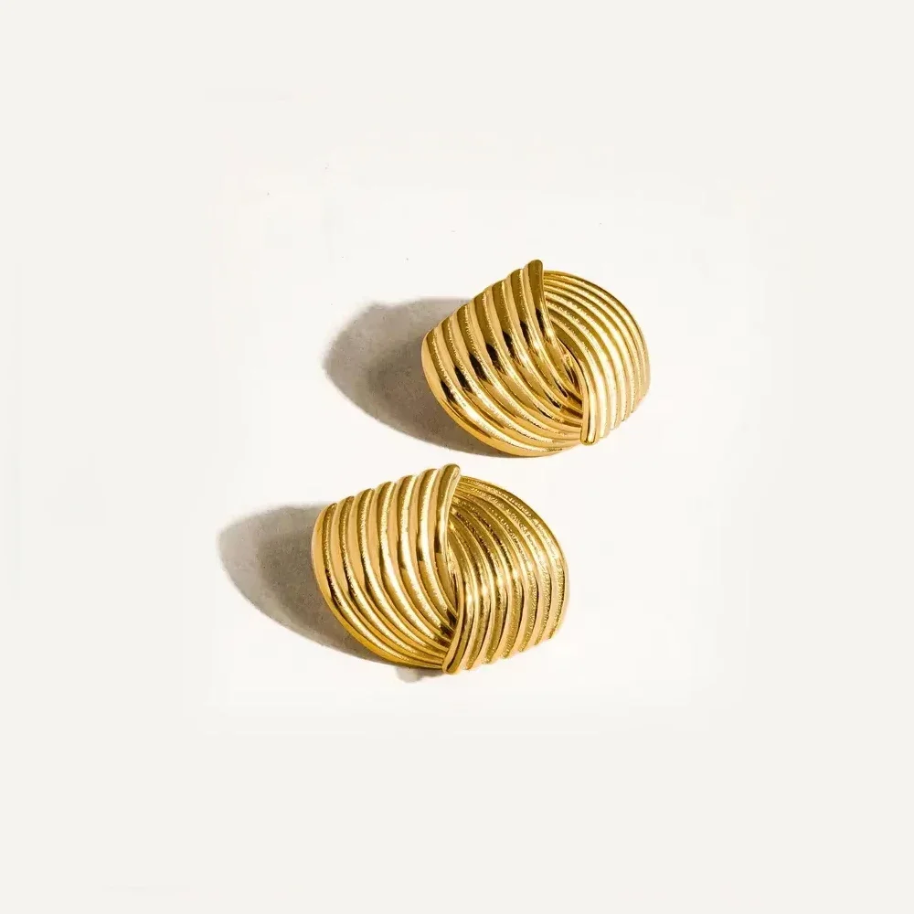Experience the elegance and modern flair of these this stylish gold-tone stainless steel earrings, perfect for elevating your look at any special occasion or everyday outing. Crafted from durable, non-tarnish stainless steel, these earrings showcase a multilayer textured design with intersecting geometric shapes. The open, hollow structure creates a lightweight yet bold statement, with a shiny, reflective finish that highlights their luxurious appearance. Their abstract, irregular rounded shape offers a trendy, contemporary edge. The versatile push-back findings suit pierced ears comfortably, ensuring secure wear. These earrings are ideal for parties, weddings, or adding a touch of sophistication to your daily style, promising both durability and eye-catching appeal that you'll love to wear repeatedly.