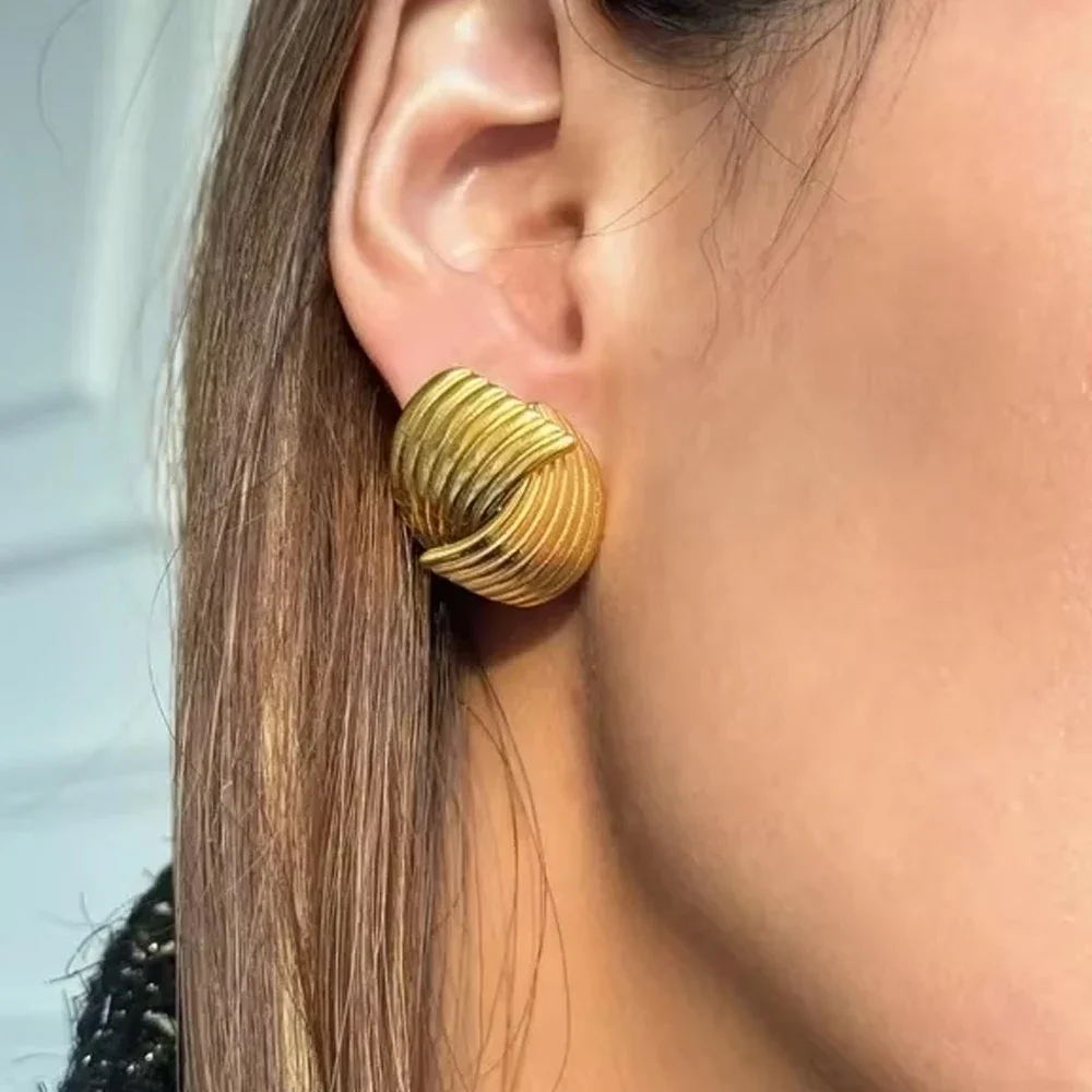 - The earrings measure approximately T040 in metal color, with a rounded, slightly curved shape that adds a trendy touch to any outfit and enhances their statement style.