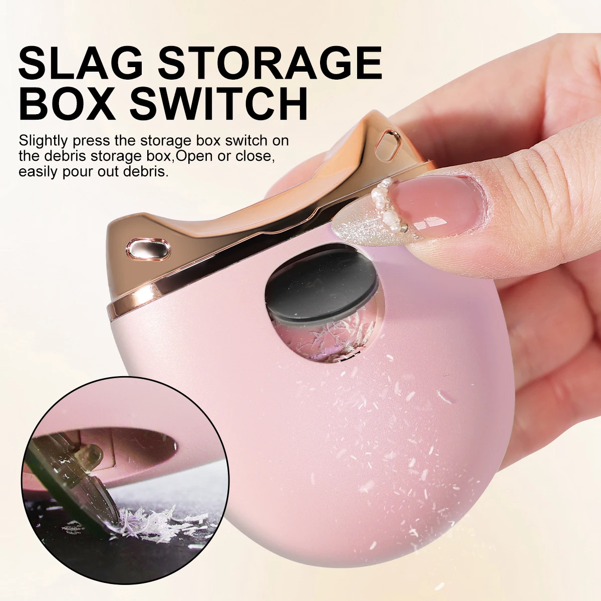 Experience safe and precise nail trimming with this sleek, ergonomic electric nail trimmer, measuring 14 x 9 x 4 cm and crafted from durable plastic. Its pastel pink design features metallic accents around the trimming slot, offering a modern and inviting look. The device includes a one-click start for effortless operation, ideal for users with limited mobility or weak hand strength. A built-in hygiene storage box collects nail debris, ensuring cleanliness after each use. Equipped with a three-layer safety system, including a hidden blade, precise hole, and arc opening, it provides a pain-free, secure experience for children, the elderly, and those with mobility challenges. Available in green, pink, and white.