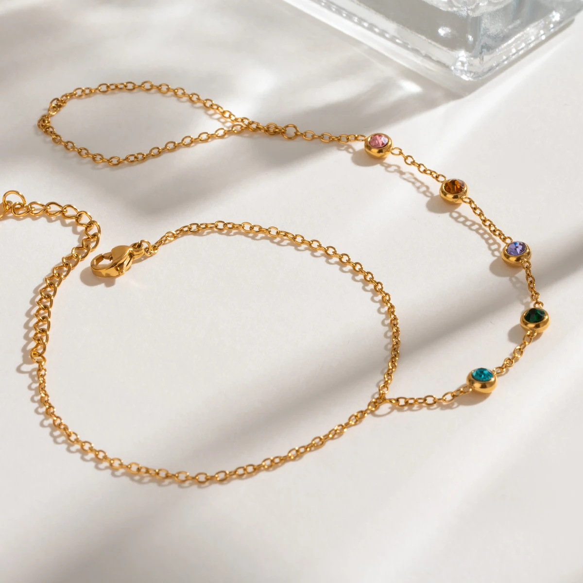 Discover the perfect blend of modern elegance and vibrant color with this jewelry set crafted from high-quality stainless steel. Featuring a delicate, minimalist chain design, the set includes a sleek necklace with a vertical pendant showcasing four bezel-set zircon stones in lively shades of pink, orange, blue, and green. The matching bracelet measures approximately 16 cm, with an adjustable extension and rounded clasp, ensuring a comfortable fit for any wrist size. Both pieces are finished with a waterproof coating, providing exceptional durability, shine, and resistance to tarnishing and water exposure. This versatile set is ideal for elevating both casual and semi-formal outfits, adding a cheerful splash of color and refined simplicity to your look.