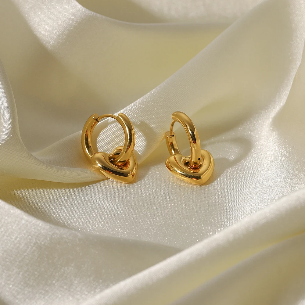 Elevate your style with these trendy stainless steel hoop earrings, featuring a bold geometric design and a removable hollow heart pendant. Measuring approximately 2 cm in length and 1.5 cm in width, each earring weighs around 15 grams, offering a substantial yet comfortable statement piece. Crafted with PVD gold stainless steel, they boast a durable, long-lasting color that resists fading, scratches, and water, making them perfect for everyday wear. Free from nickel, lead, and cadmium, these earrings combine safety with fashion-forward sophistication. Their chunky, versatile design makes them ideal for adding a luxurious touch to any modern outfit.