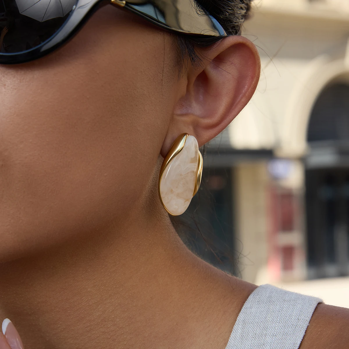 Experience elegance and style with these trendy stainless steel women’s stud earrings, model number JDE0106002-BR, featuring an irregular resin centerpiece encased in a sleek platinum-coated gold finish. Designed for a secure fit with screw-back fastenings, these earrings showcase organic, asymmetrical shapes in four vibrant color options: white with a marbled, translucent appearance; rich amber with natural patterns; glossy green with a polished finish; and delicate pink with a pearlescent effect. Crafted without concerning chemicals, they elevate any outfit for parties or stylish events, making them perfect for those who appreciate unique, fashionable accessories that combine modern design with everyday wear.