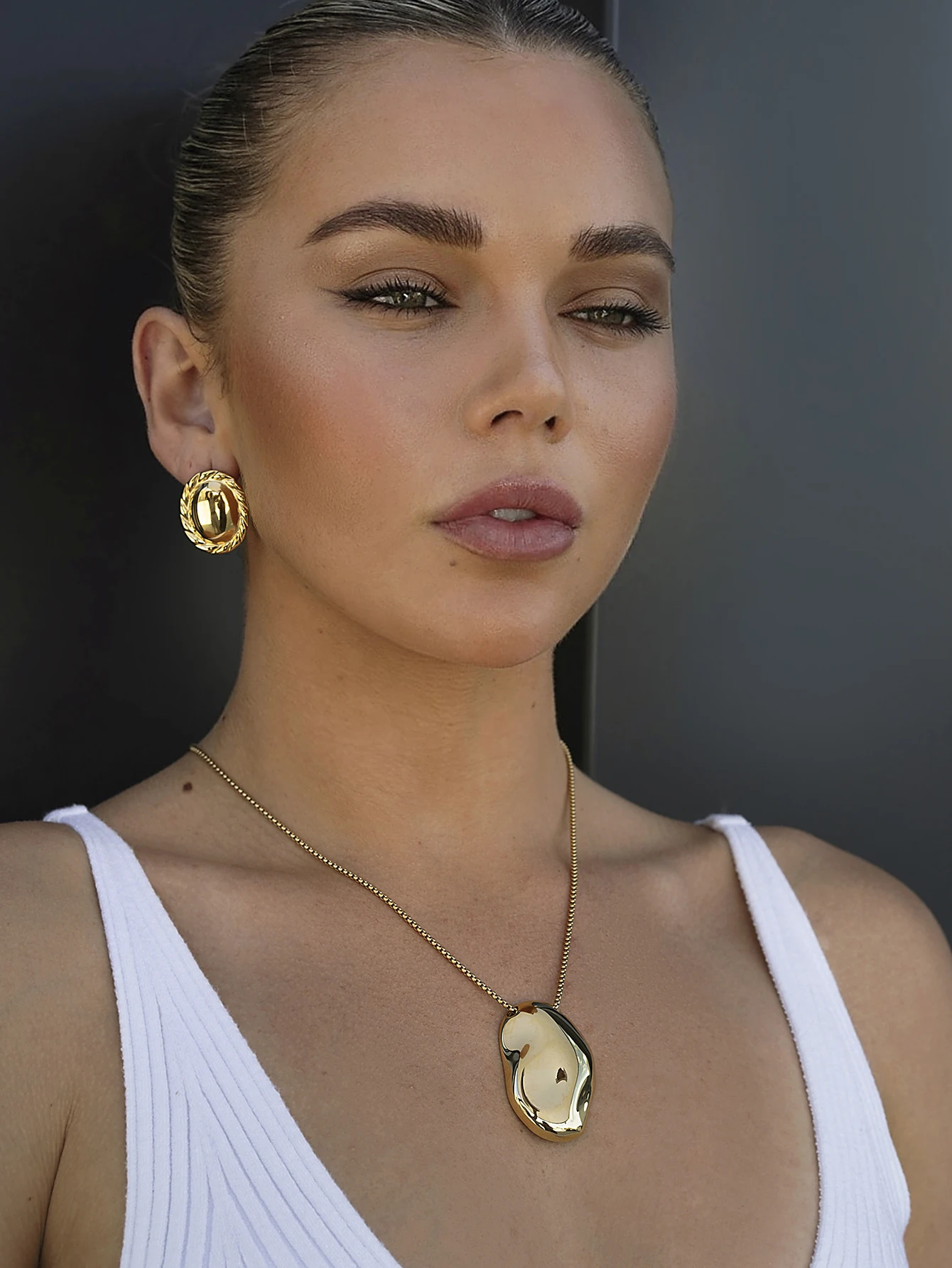 - Features an irregular, concave hammered pendant in a trendy geometric shape, providing a modern, artistic look for fashionable occasions.